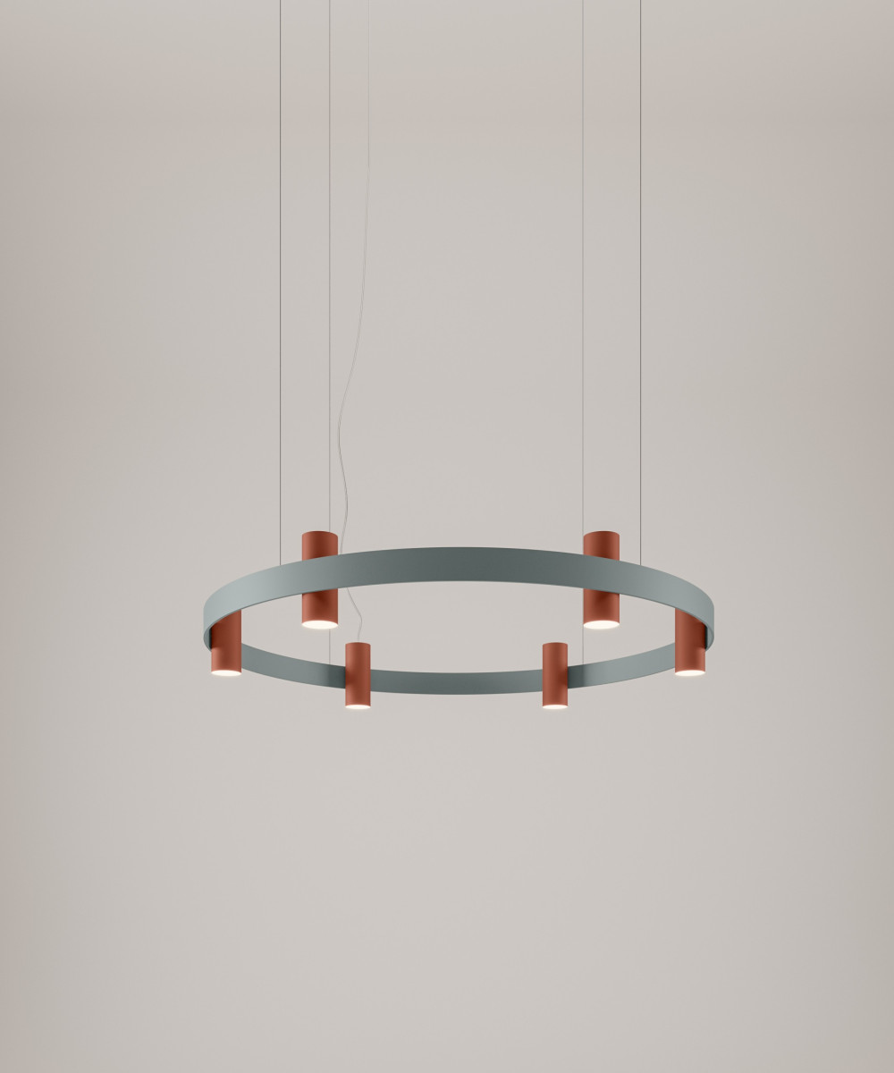 The Nastro collection of suspension, wall, floor and table lamps designed by Studiopepe sees an epoxy powder coated aluminum band structure accompanied by a cylindric weight that counterbalances its flexuosity, in a refined visual balance. The light source consists of a dimmable LED strip; the cylinders are available in epoxy powder coated metal, in wood, in brushed brass and in raw concrete.