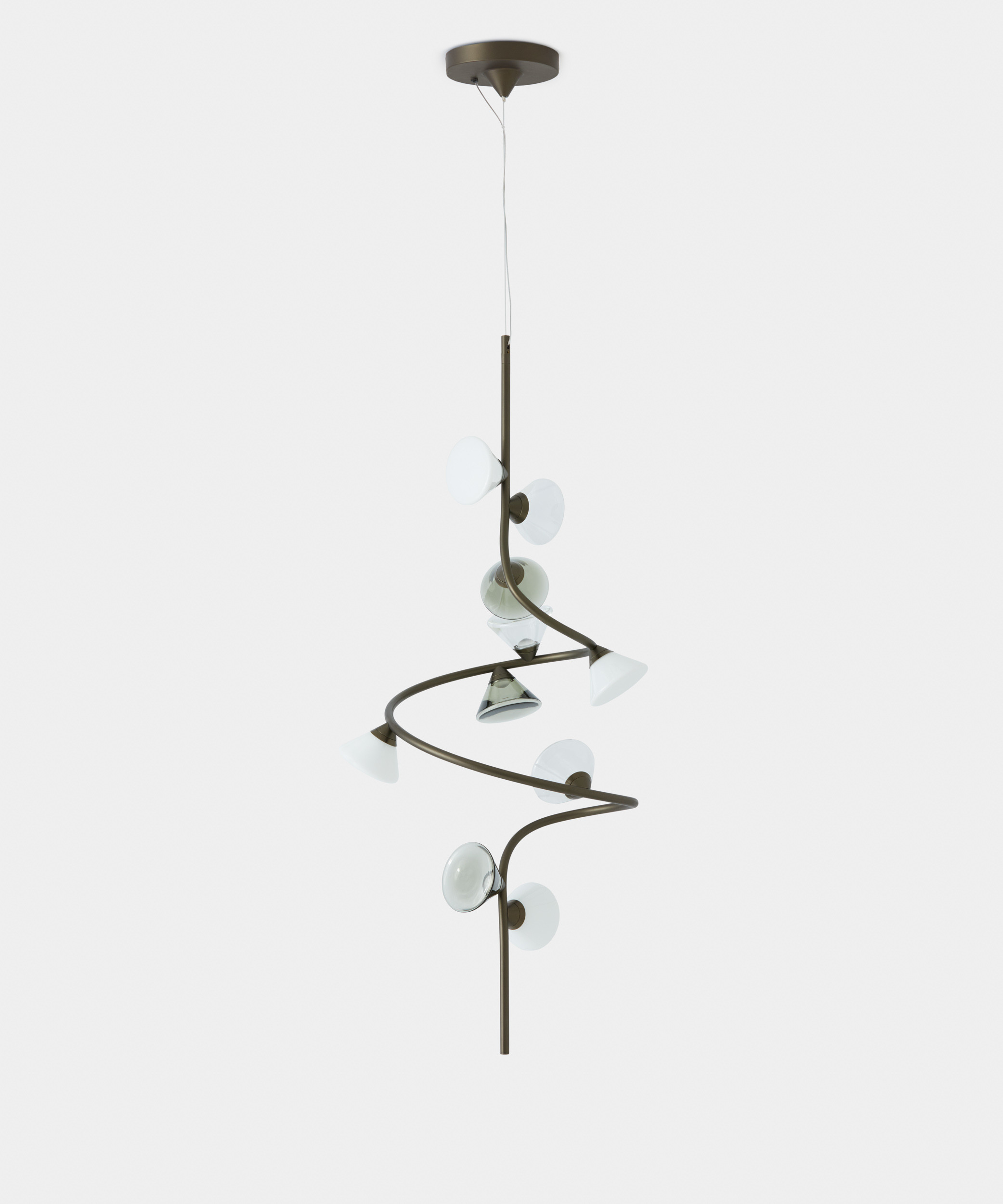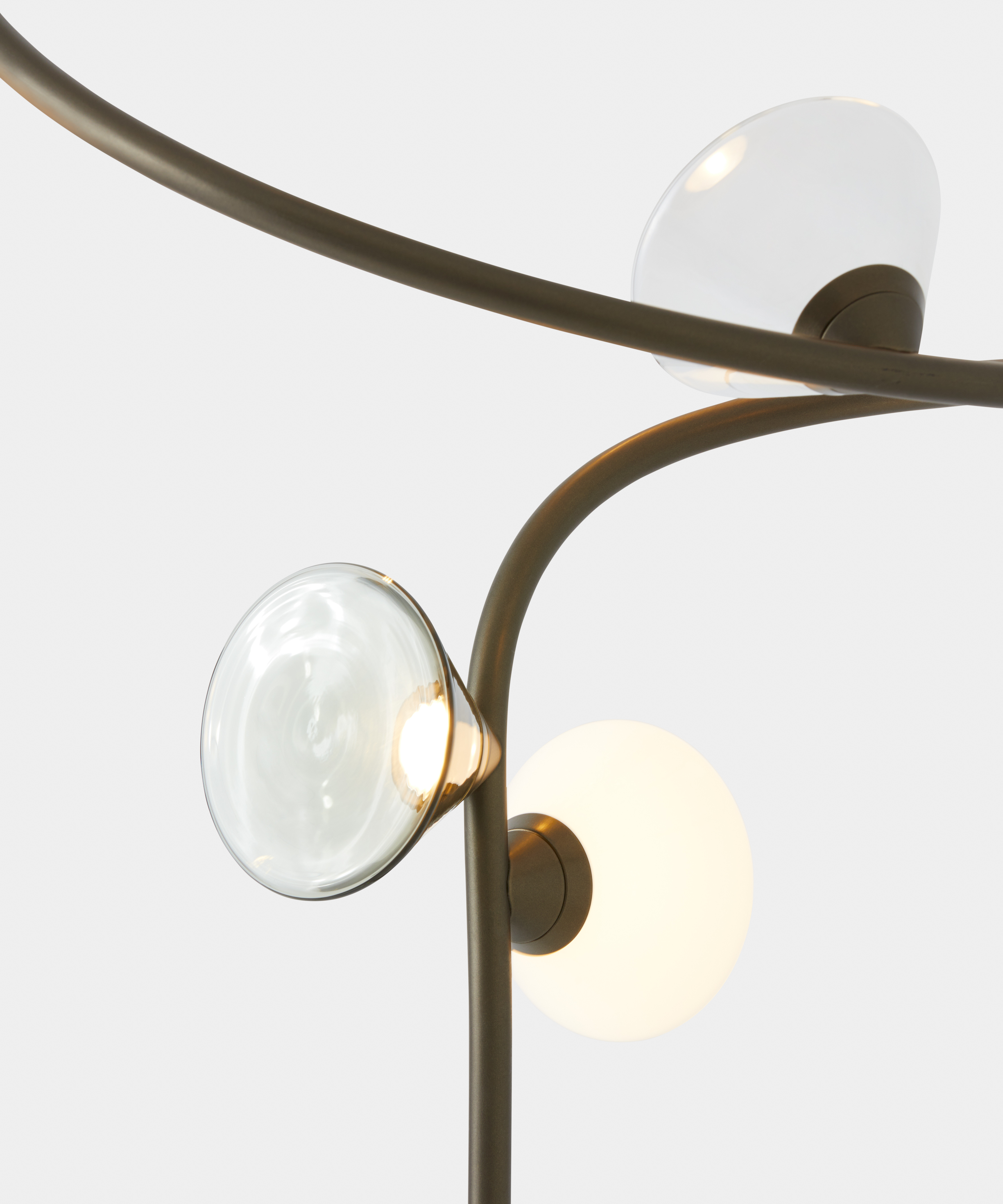 Connotata da un’evidente ispirazione naturalistica, la famiglia di lampade Linfa progettata da Federico Peri si dispiega su bracci tanto sinuosi ed eleganti da evocare le nervature che percorrono le foglie, con luminosi punti luce che brillano come gocce di rugiada. In questa famiglia, composta da lampade a sospensione, da terra, da tavolo e appliques, le raffinate diramazioni sono disponibili nelle finiture oro, titanio o nickel opaco, mentre le fonti luminose, realizzate in vetro di Murano, sono declinate nelle finiture fumé, trasparente o bianco latte.