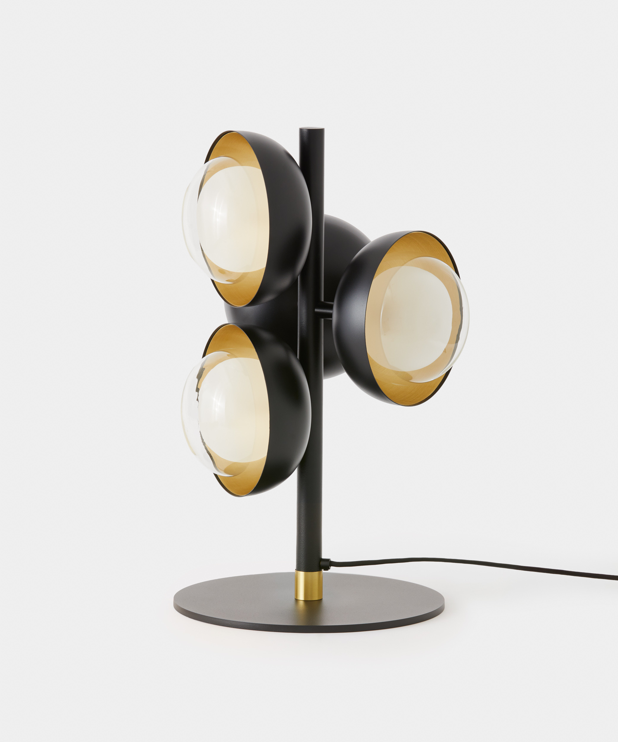 Collezione di lampade dal sapore neo-vintage in metallo con diffusore a doppia parete in vetro borosilicato. Le cupole (una interna e l’altra esterna) in metallo hanno la parte interna in ottone spazzolato. La collezione è composta di lampade a sospensione, piantana, lampada da tavolo e lampade da parete e soffitto. Nelle versioni a sospensione e parete è presente un’ulteriore sorgente G9 posizionata nella parte inferiore della lampada.
