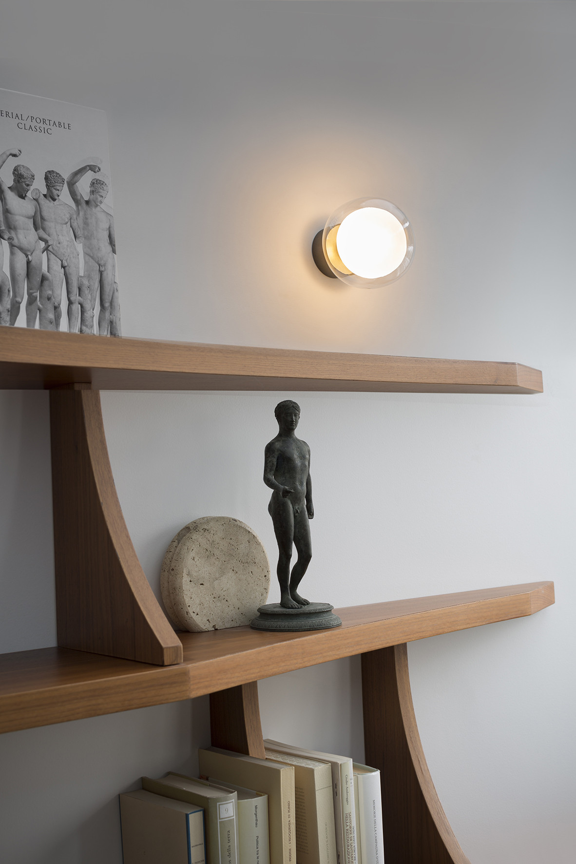 Collezione di lampade eleganti e sofisticate, ispirata agli anni '50, concepita come dettaglio distintivo per arricchire ogni ambiente. Una sfera luminosa in vetro borosilicato, visibile su entrambi i lati, caratterizza il design della collezione, proposta in molteplici composizioni. La struttura metallica, verniciata a polvere epossidica, è disponibile nelle finiture standard: nero con dettagli in ottone spazzolato oppure cromo nero, abbinati rispettivamente a vetri trasparenti o fumé. A queste si aggiunge ora una nuova raffinata variante: titanio spazzolato con dettagli bronzo e vetri champagne, per un effetto più caldo e sofisticato. La collezione comprende una vasta gamma di soluzioni per ogni tipo di ambiente: lampadari (in diversi modelli), lampade da tavolo, versioni da comodino (più compatte), lampade da terra e da parete (queste ultime in tre varianti, pensate sia per installazioni singole che modulari e su misura). I lampadari possono essere liberamente personalizzati, combinando i diversi elementi per creare composizioni uniche e su misura per ogni spazio. Tutti i modelli sono ora disponibili anche con sorgenti LED integrate, per garantire elevate prestazioni luminose e massima efficienza energetica, mantenendo intatta la purezza del design. Un equilibrio tra ricchezza e misura, racchiuso in un unico elemento di design.