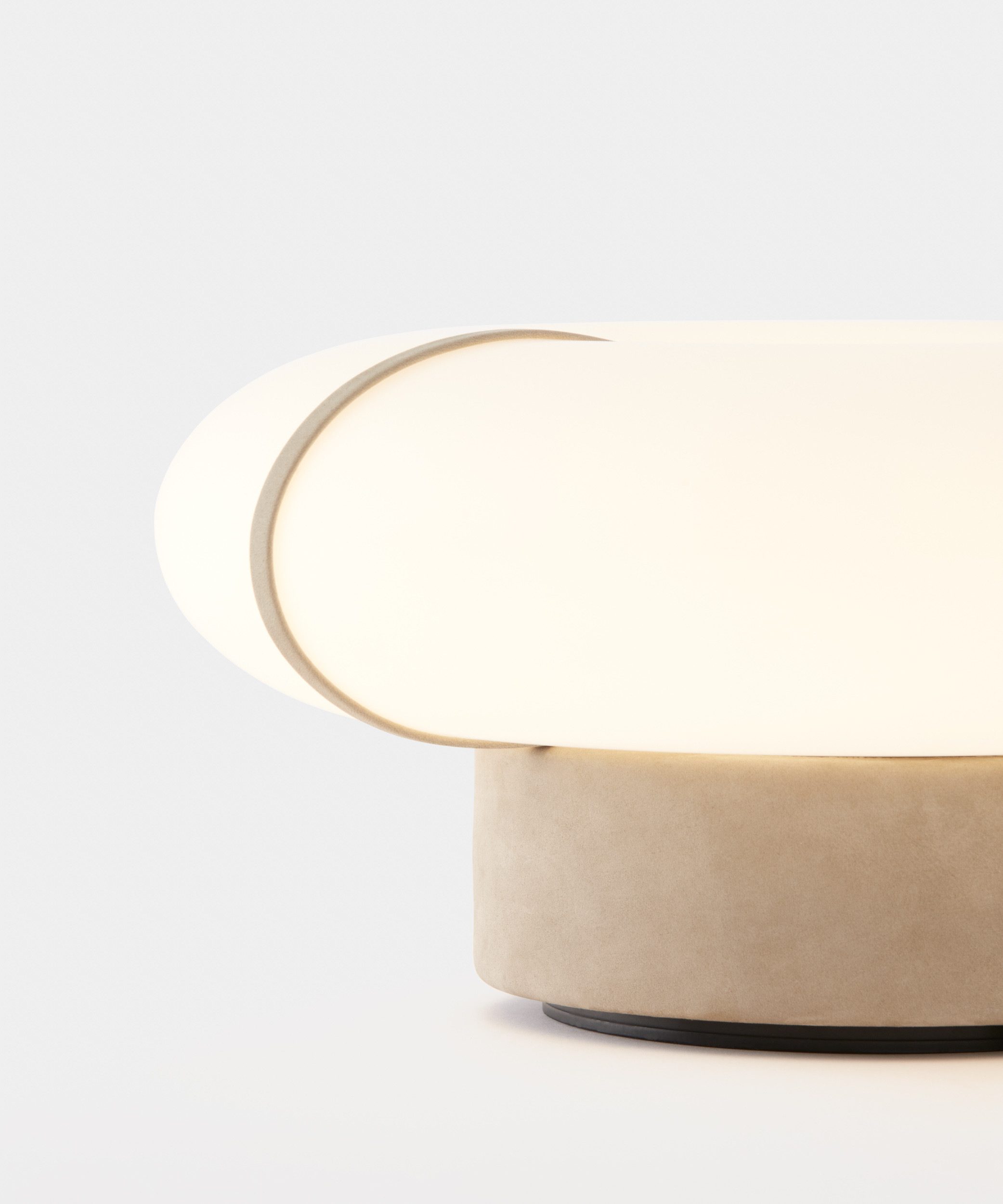 Inspired by the nautical world, Bolina, designed by Fabio Fantolino, translates the balance between lightness and stability into a timeless, essential design. Its name recalls the sailing course that allows a boat to rise against the wind — a metaphor for movement and harmony. The luminous body, crafted in satin amber glass with caramel nubuck leather straps or in satin white glass with light beige leather, shapes soft, welcoming volumes, like a lifebuoy embracing the light. Available in two sizes (Ø 35 and Ø 50 cm) and in pendant, wall, table, and ceiling versions, Bolina casts a uniform, enveloping glow, bringing sophistication and contemporary charm to any interior.