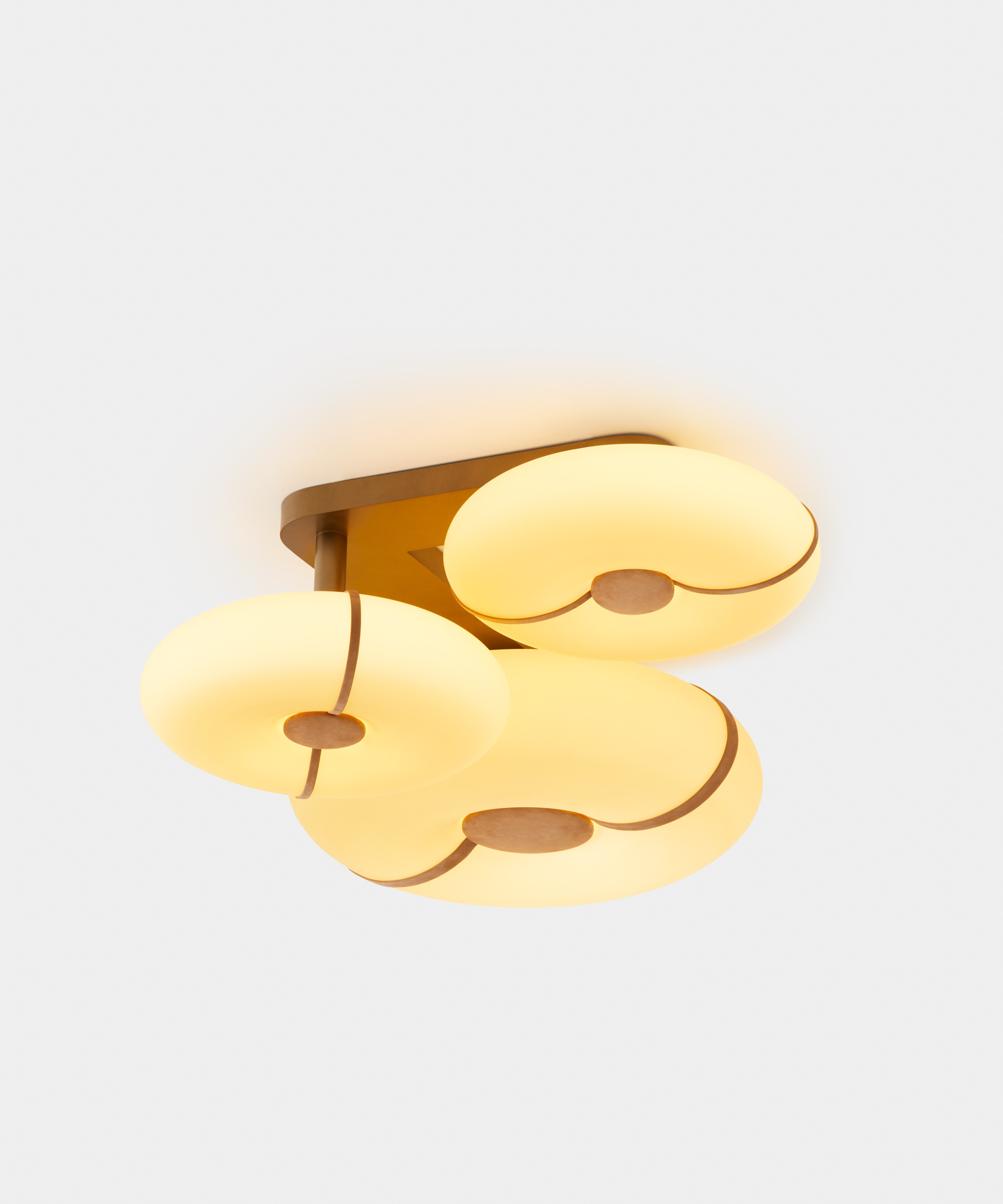 The luminous body, crafted in satin amber glass with caramel nubuck leather straps or in satin white glass with light beige leather, shapes soft, welcoming volumes, like a lifebuoy embracing the light.