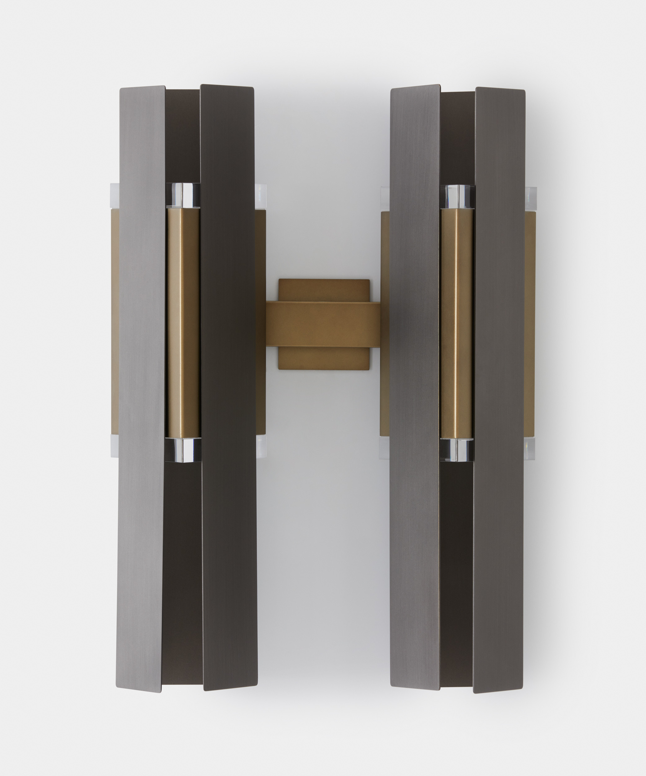 A lamp with subtle Deco inspiration, featuring a black-coated body and two plexiglass prisms that diffuse the light, wrapped in three brushed metal foils. In addition to the classic brushed brass finish, the collection is now also available in satin bronze and satin titanium, offering new interpretations of its elegant geometry. Excalibur comes in multiple configurations: single or clustered suspensions, two sizes of chandelier, and wall versions in single or double format.