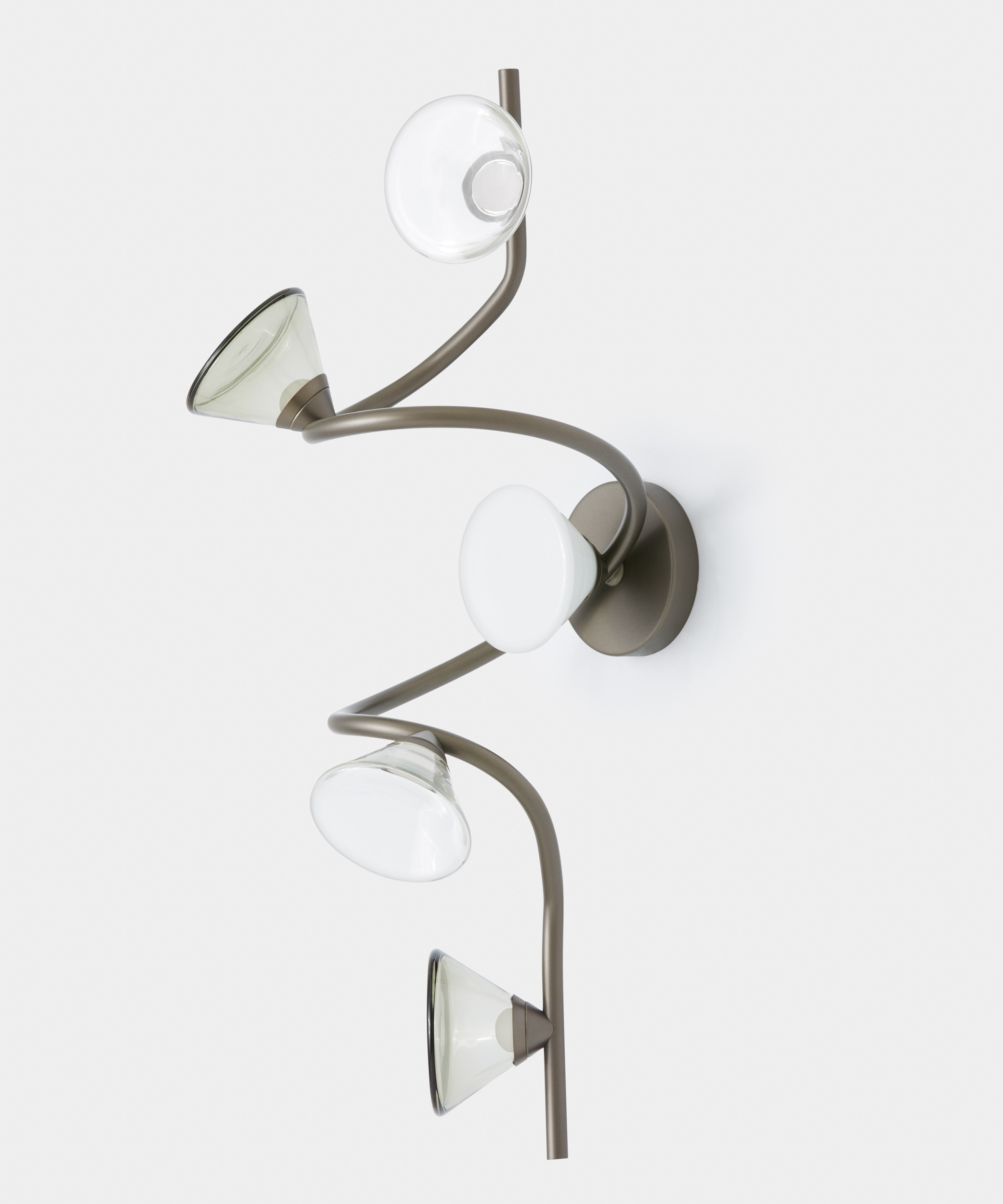 Inspired and characterized by the natural world, the Linfa family of lamps designed by Federico Peri unfolds on arms so sinuous and elegant as to evoke the veins that run through the leaves, with bright points of light that shine like dew drops. In this family, made up of pendant, floor, table lamps and wall sconces, the refined branches are available in gold, titanium or matt nickel finishes, while the light sources, made of Murano glass, are available in smoky and transparent finishes or milky white.