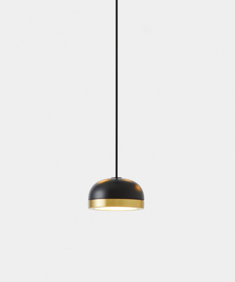 Collection of contemporary hanging, wall, floor, table, side and ceiling lamps with a painted dome and ring either painted or finished with brushed brass, copper or pewter. The bright diamond screen is made of plexiglass to better spread light out. The collection presents lamps available in three sizes for single-unit or dynamic compositions. These lamps are very versatile and fit any kind of setting, thanks to their simple shape yet rich materials.