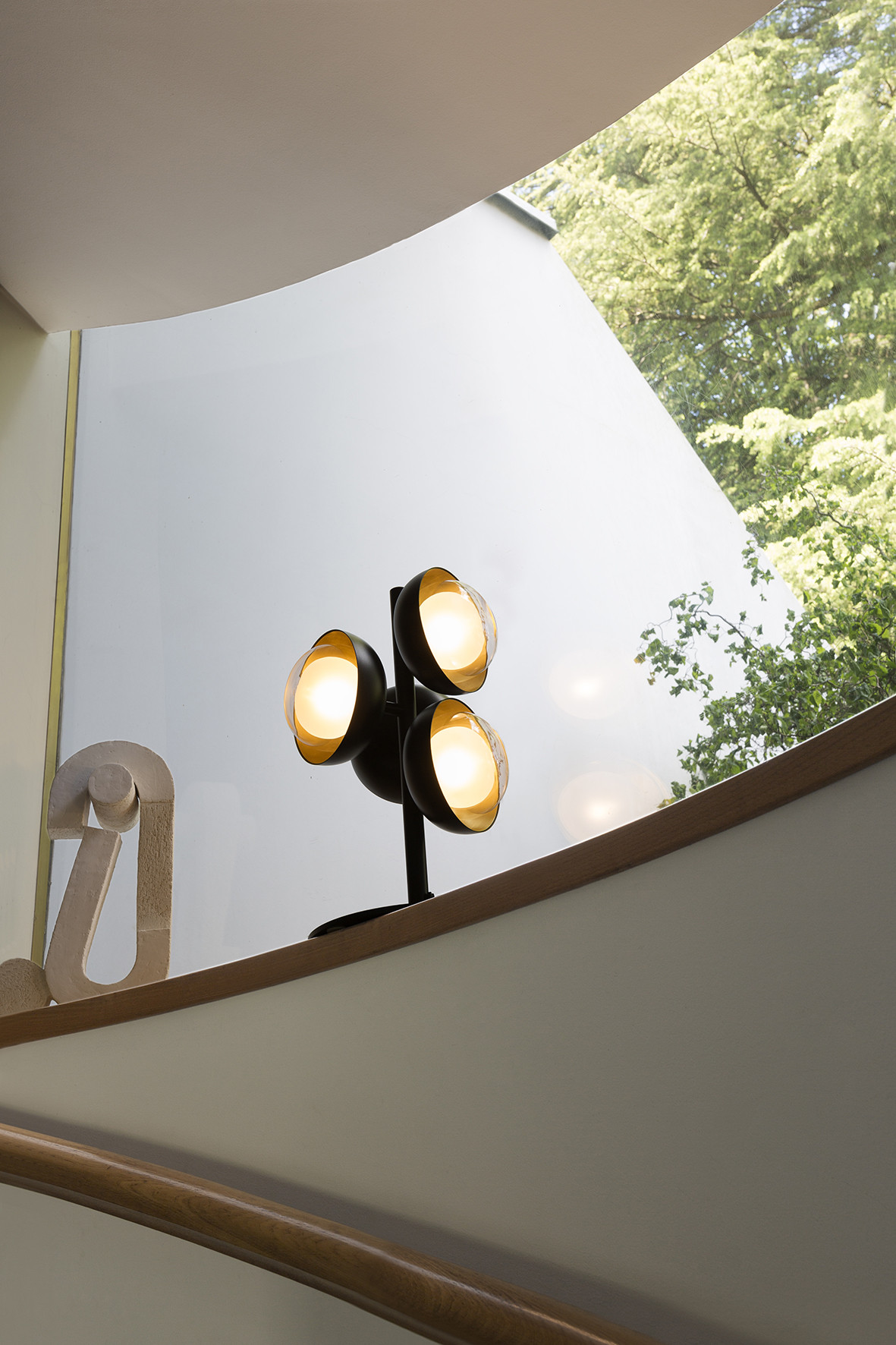 Collection of neo-vintage metal lamps with a double-sided diffuser in borosilicate glass. The metal domes (one internal and the other one external) have the internal side with different colors or finishing: they can be painted or finished in polished brass and bright copper, thus to create different textural combinations. The collection presents hanging lamps, floor lamp, table lamp, wall and ceiling. The hanging and wall lamp version are provided with a further G9 source located in the lower part of the lamp.