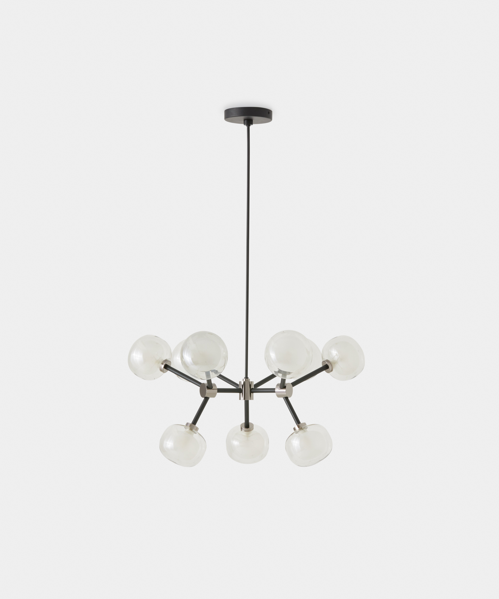50s inspired collection of elegant and sophisticated lamps representing the detail to enrich any location. A double-sided spherical bright object in borosilicate glass makes these lamps available in different compositions and a structure made by metal coated with epoxy powder enriched with brushed brass or black chrome details. Different varieties are available for any situation: chandeliers (in different models) or table lamp, bedside (smaller), floor or wall (available in three different models for single or composite personalized installation). The chandeliers can be customized by combining the various types together in order to create new unique dimensions for each environment. Richness and sobriety all in one single element.