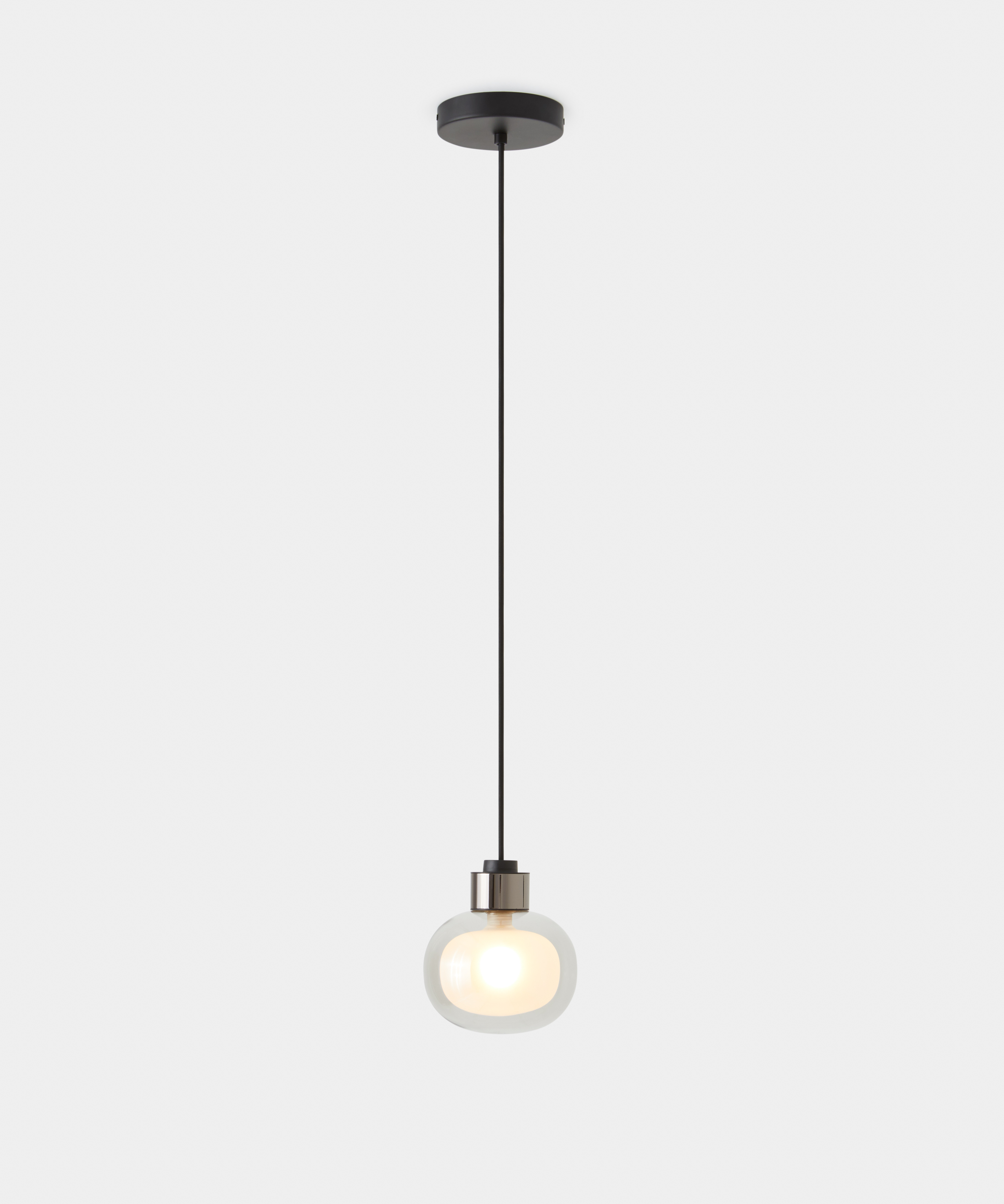 A double-sided luminous sphere in borosilicate glass defines the character of the collection, available in multiple compositions.
