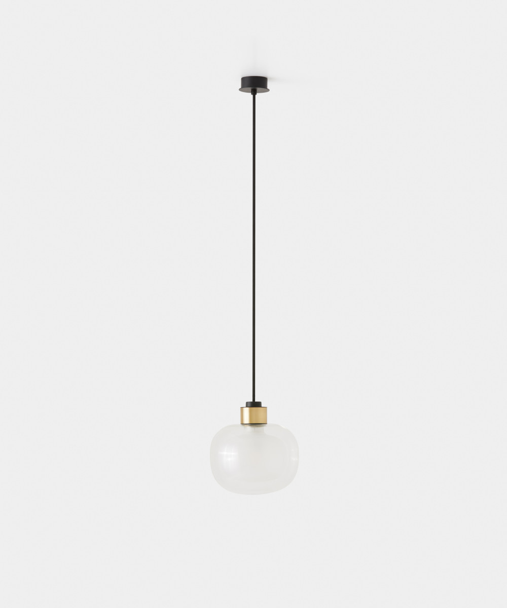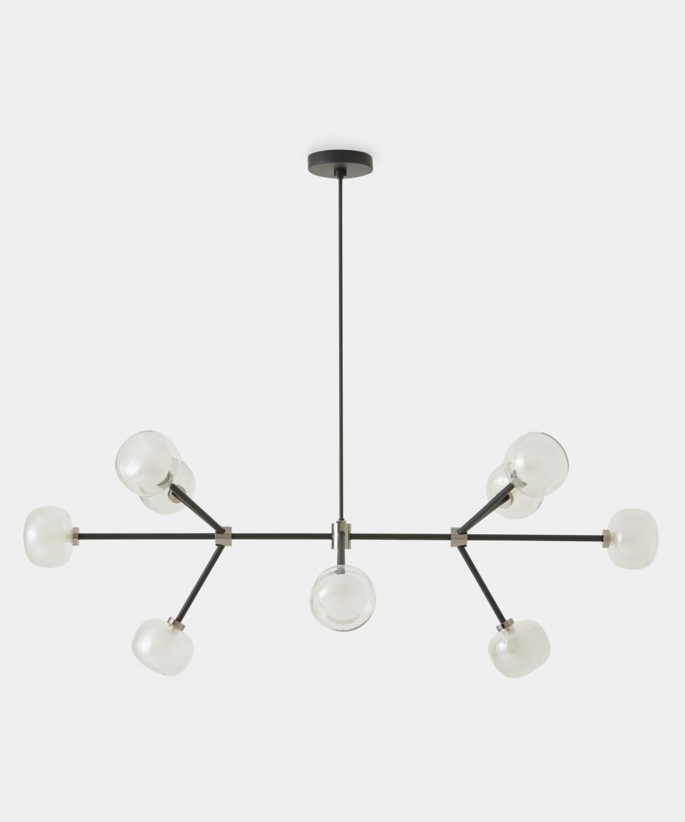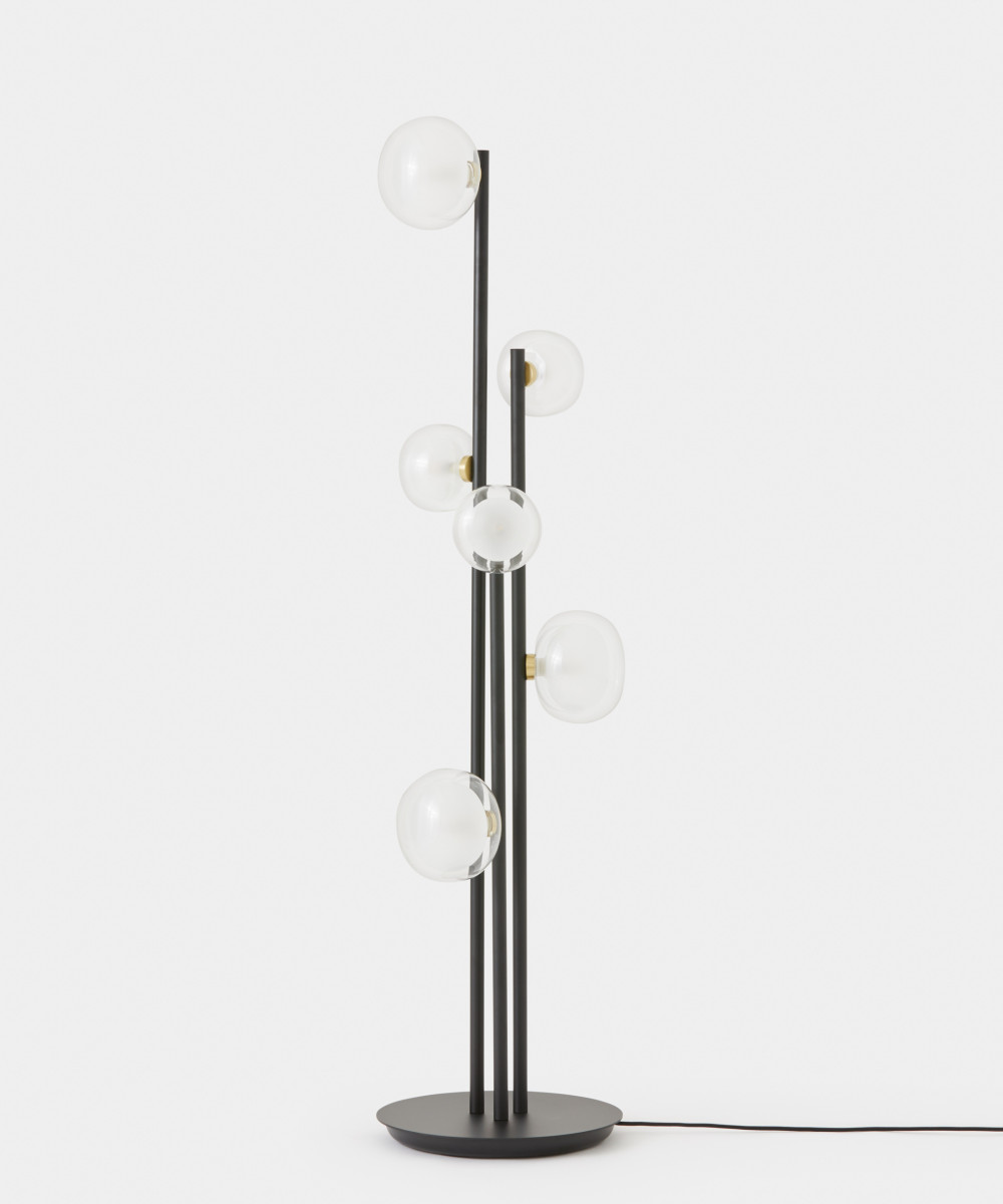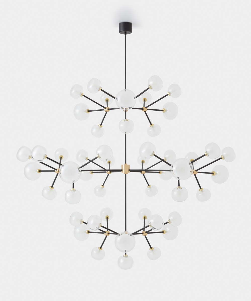 50s inspired collection of elegant and sophisticated lamps representing the detail to enrich any location. A double-sided spherical bright object in borosilicate glass makes these lamps available in different compositions and a structure made by metal coated with epoxy powder enriched with brushed brass or black chrome details. Different varieties are available for any situation: chandeliers (in different models) or table lamp, bedside (smaller), floor or wall (available in three different models for single or composite personalized installation). The chandeliers can be customized by combining the various types together in order to create new unique dimensions for each environment. Richness and sobriety all in one single element.