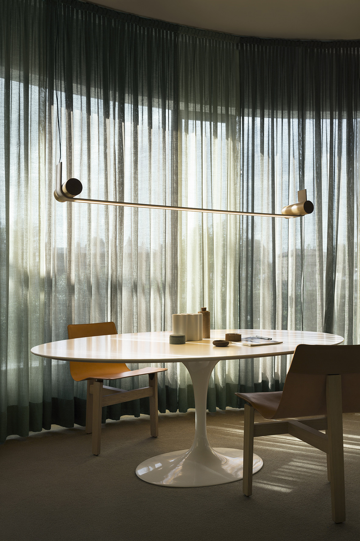 The Nastro collection of suspension, wall, floor and table lamps designed by Studiopepe sees an epoxy powder coated aluminum band structure accompanied by a cylindric weight that counterbalances its flexuosity, in a refined visual balance. The light source consists of a dimmable LED strip; the cylinders are available in epoxy powder coated metal, in wood, in brushed brass and in raw concrete.