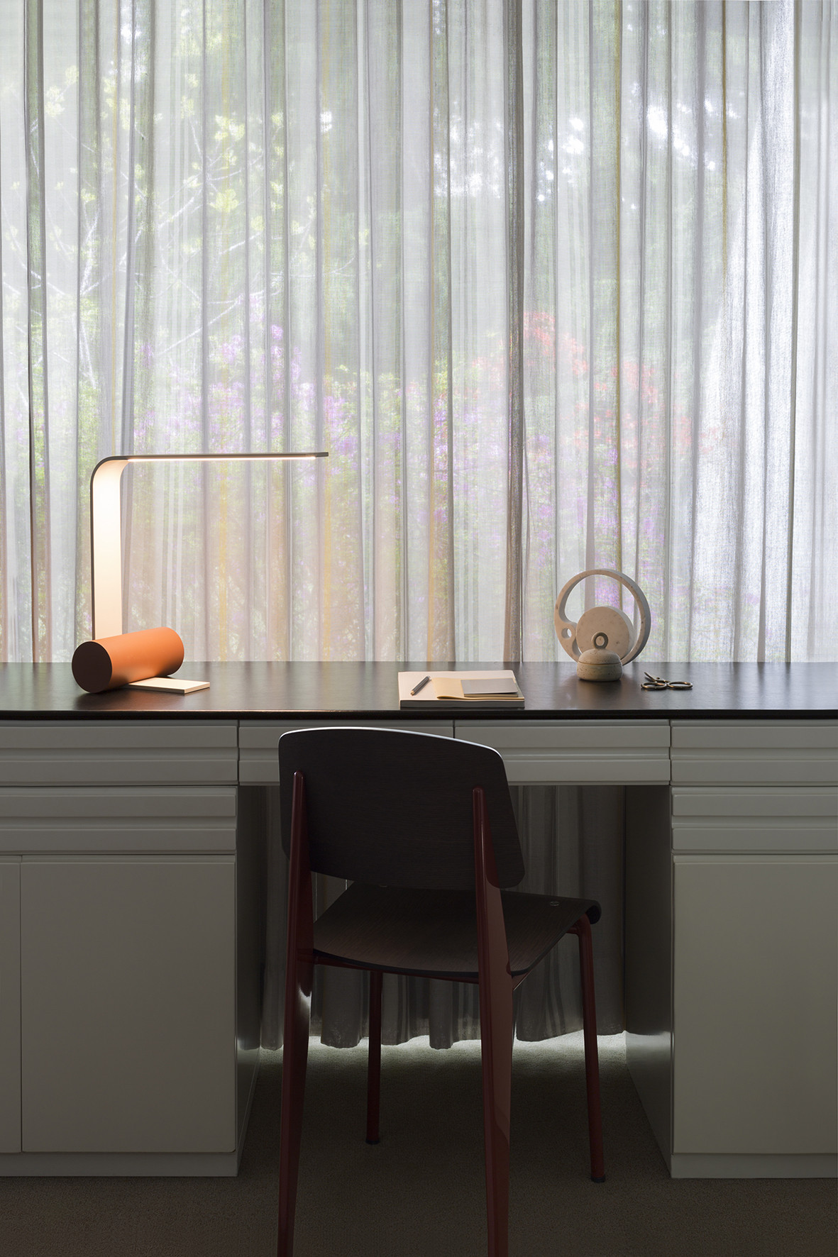 The Nastro collection of suspension, wall, floor and table lamps designed by Studiopepe sees an epoxy powder coated aluminum band structure accompanied by a cylindric weight that counterbalances its flexuosity, in a refined visual balance. The light source consists of a dimmable LED strip; the cylinders are available in epoxy powder coated metal, in wood, in brushed brass and in raw concrete.