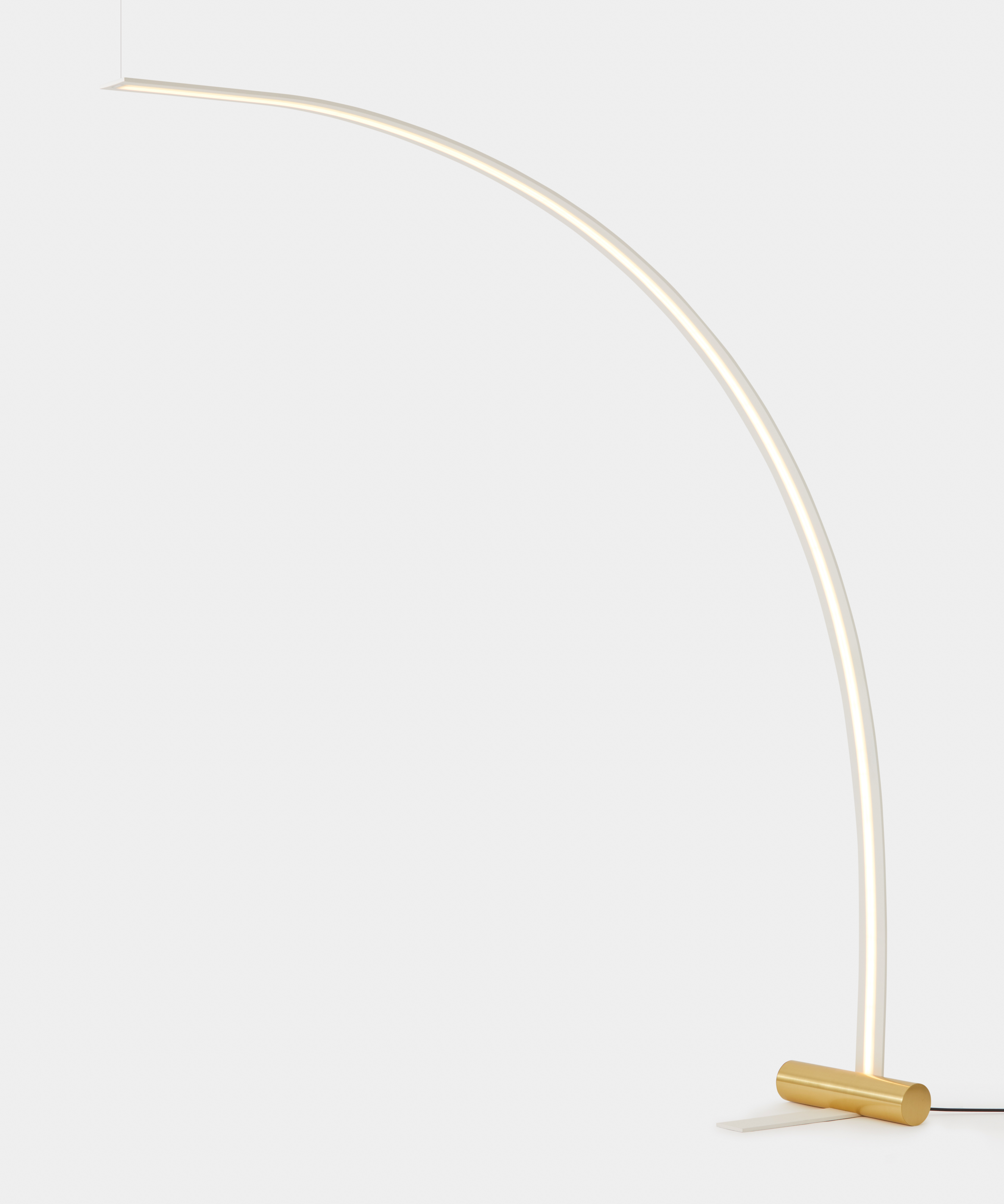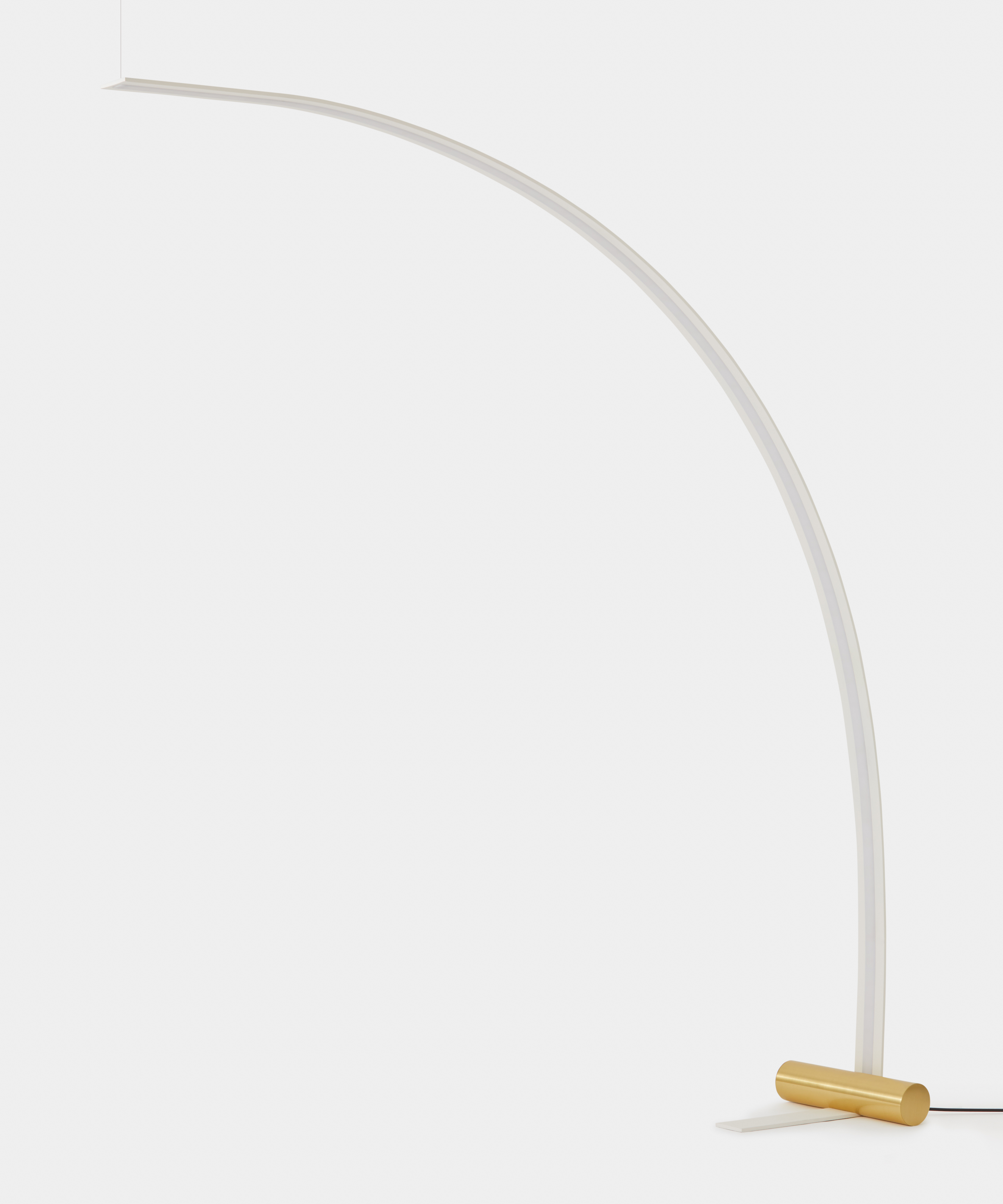 The Nastro collection of suspension, wall, floor and table lamps designed by Studiopepe sees an epoxy powder coated aluminum band structure accompanied by a cylindric weight that counterbalances its flexuosity, in a refined visual balance. The light source consists of a dimmable LED strip; the cylinders are available in epoxy powder coated metal, in wood, in brushed brass and in raw concrete.