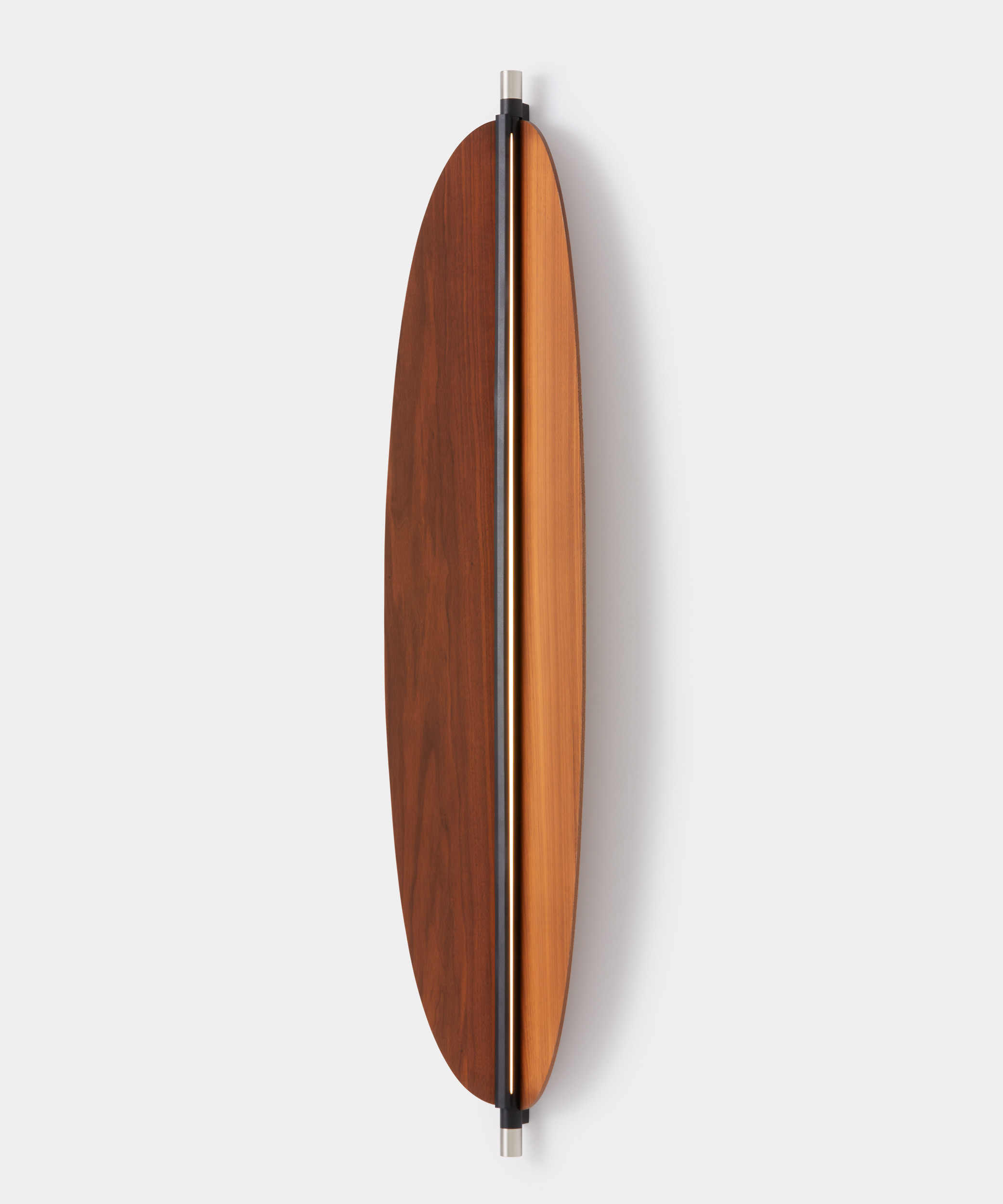 Designed by Federica Biasi, the Thula appliques and suspension lamps are based on a simple and architectural central element with an illuminating function to which an organic component in wood or quilted leather is added in a skillful game of addition and subtraction. Consists of a linear dimmable LED; in the simple wall version it can be oriented, thus giving direct or indirect light.