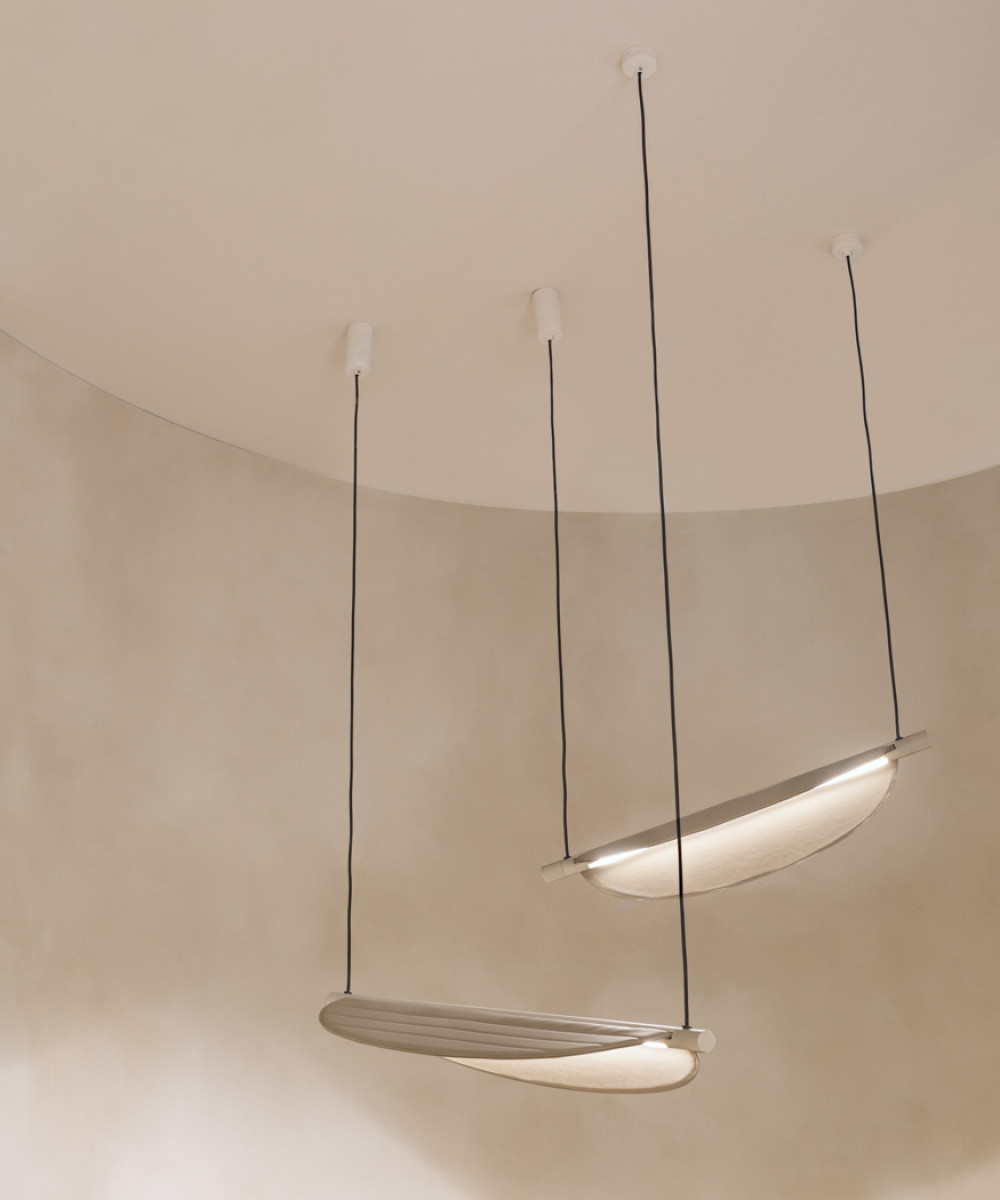 Designed by Federica Biasi, the Thula appliques and suspension lamps are based on a simple and architectural central element with an illuminating function to which an organic component in wood or quilted leather is added in a skillful game of addition and subtraction. Consists of a linear dimmable LED; in the simple wall version it can be oriented, thus giving direct or indirect light.