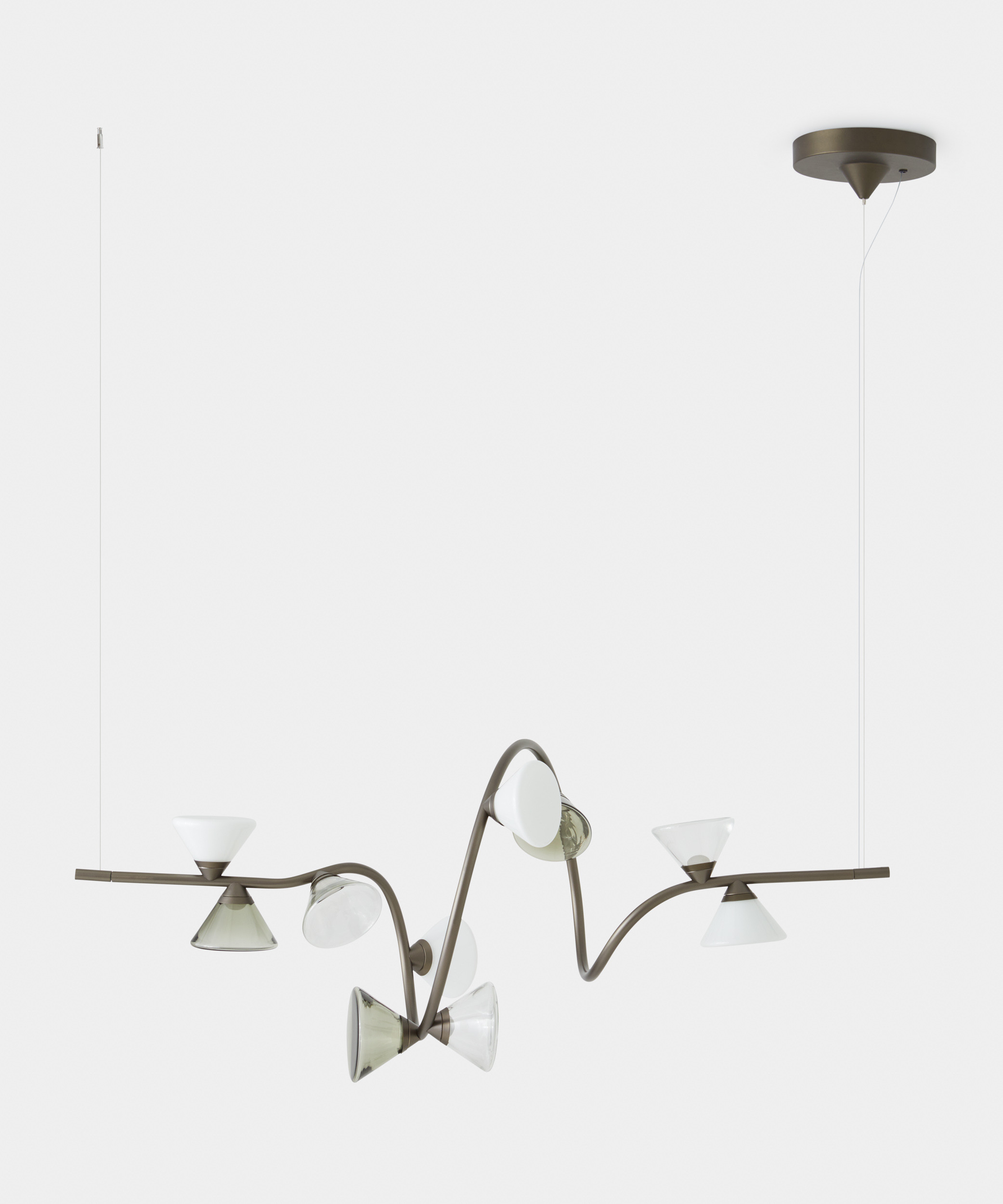 Connotata da un’evidente ispirazione naturalistica, la famiglia di lampade Linfa progettata da Federico Peri si dispiega su bracci tanto sinuosi ed eleganti da evocare le nervature che percorrono le foglie, con luminosi punti luce che brillano come gocce di rugiada. In questa famiglia, composta da lampade a sospensione, da terra, da tavolo e appliques, le raffinate diramazioni sono disponibili nelle finiture oro, titanio o nickel opaco, mentre le fonti luminose, realizzate in vetro di Murano, sono declinate nelle finiture fumé, trasparente o bianco latte.