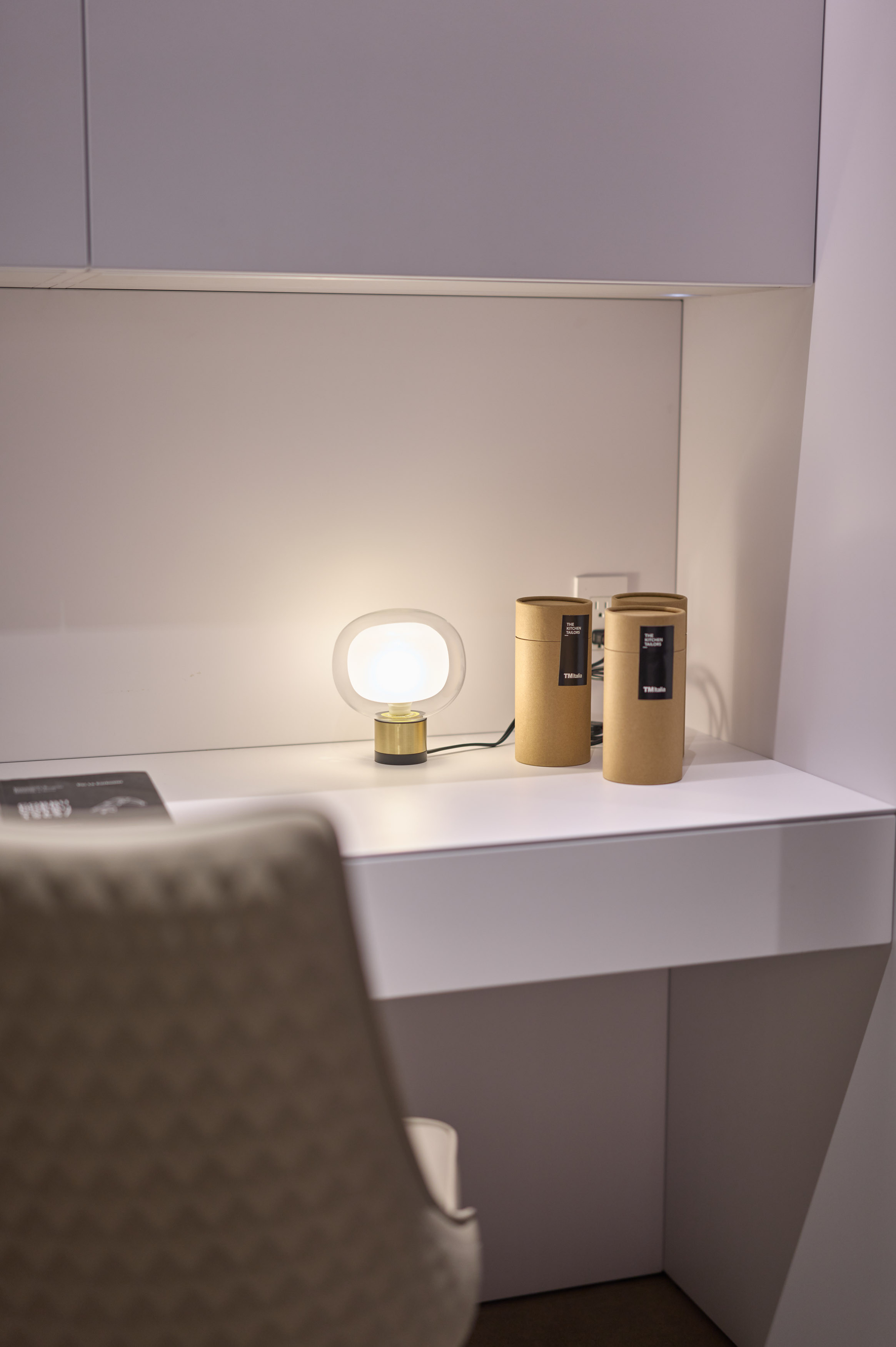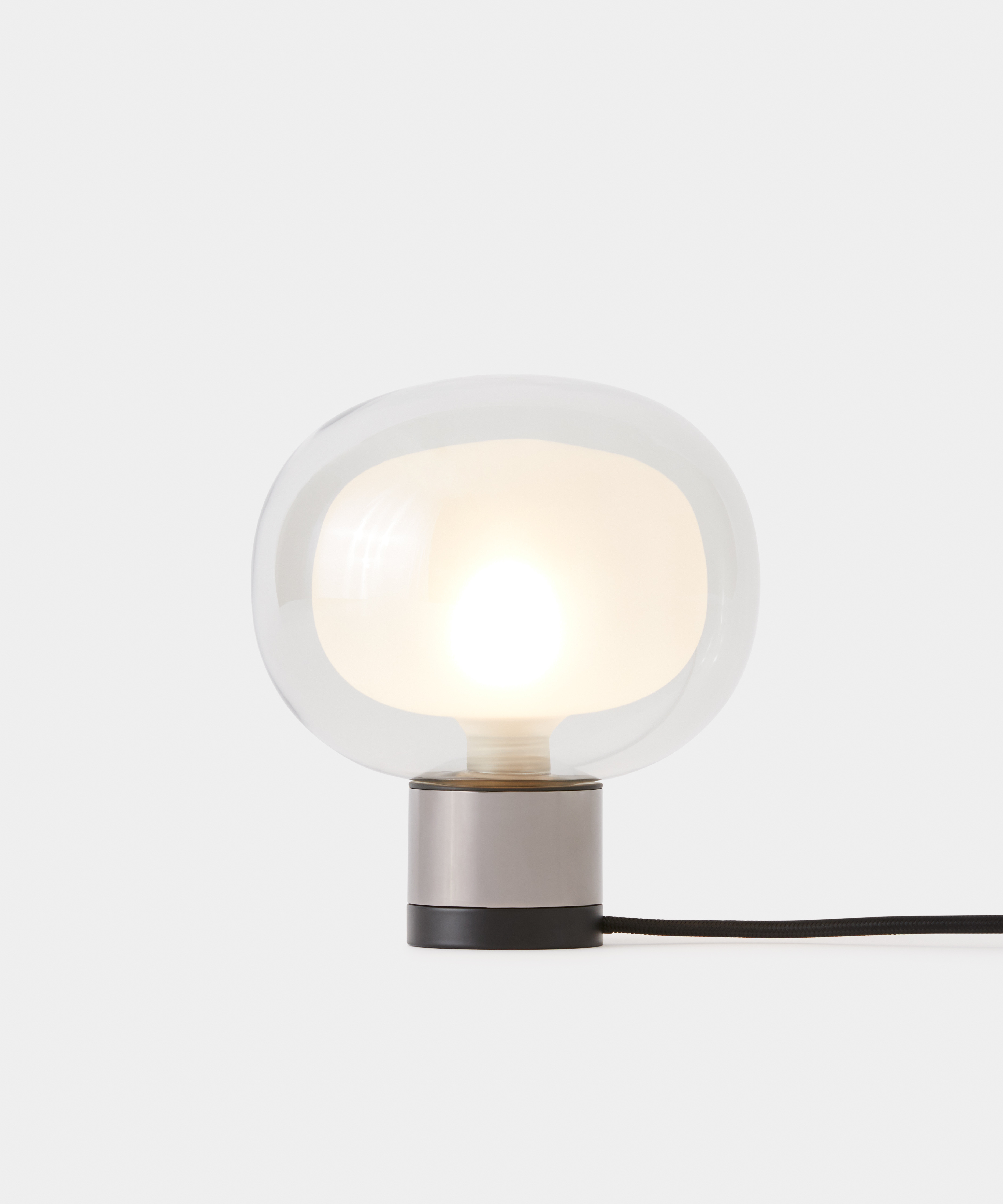Una sfera luminosa in vetro borosilicato, visibile su entrambi i lati, caratterizza il design della collezione, proposta in molteplici composizioni.