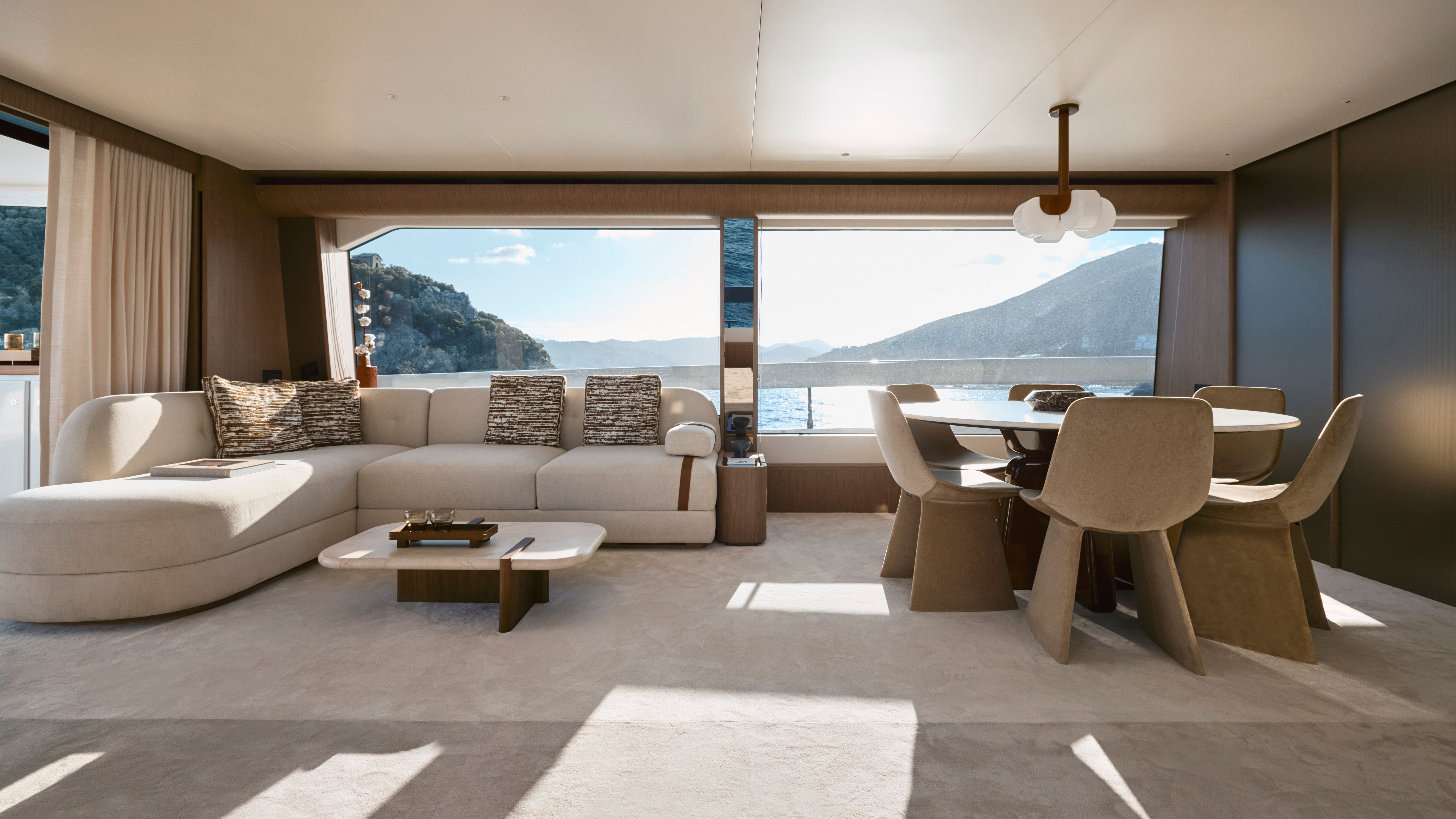 A dialogue between light and design on the new Fly 82, where the Stilla collection by TOOY illuminates Fabio Fantolino’s interiors with understated elegance.