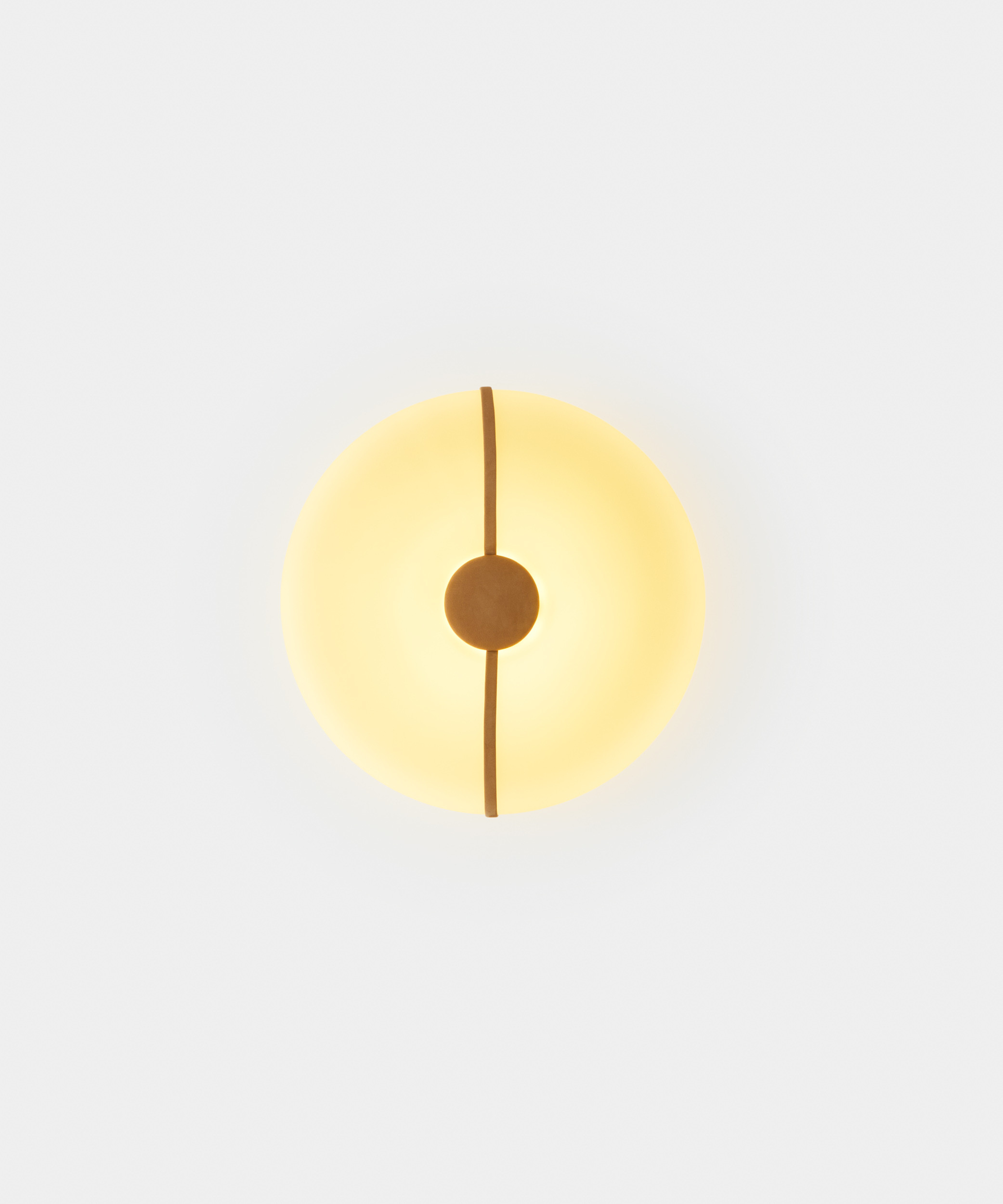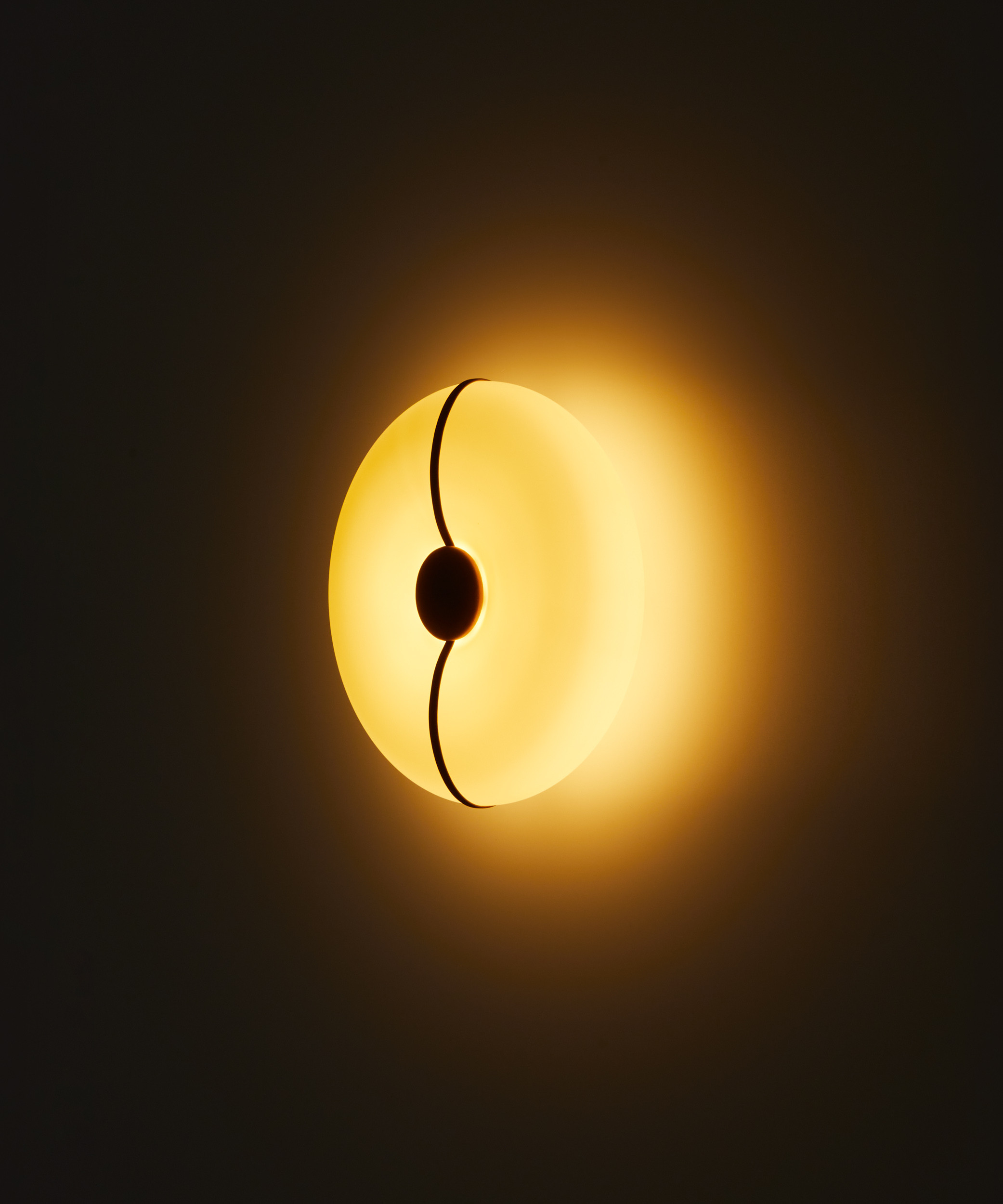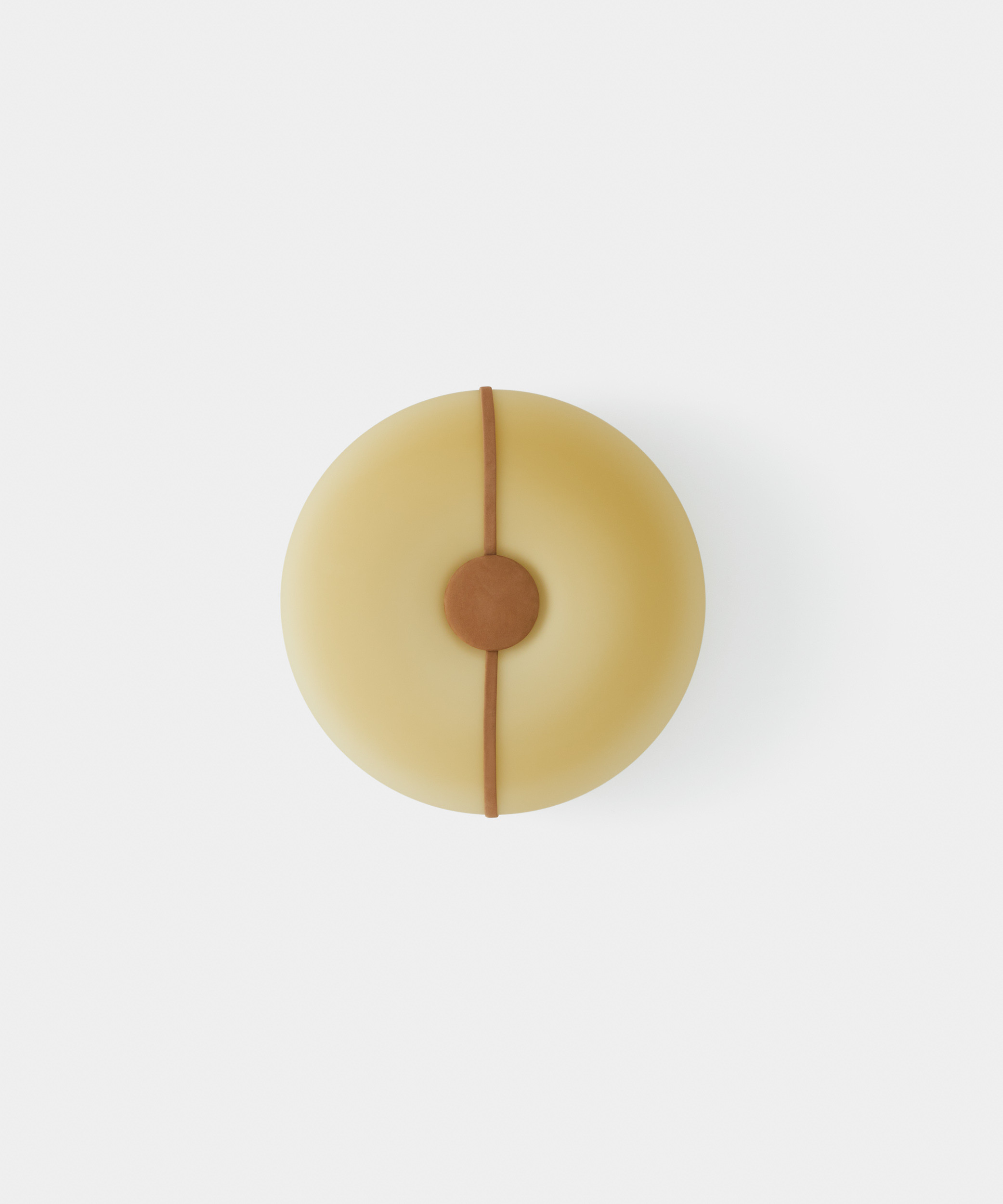 The luminous body, crafted in satin amber glass with caramel nubuck leather straps or in satin white glass with light beige leather, shapes soft, welcoming volumes, like a lifebuoy embracing the light.