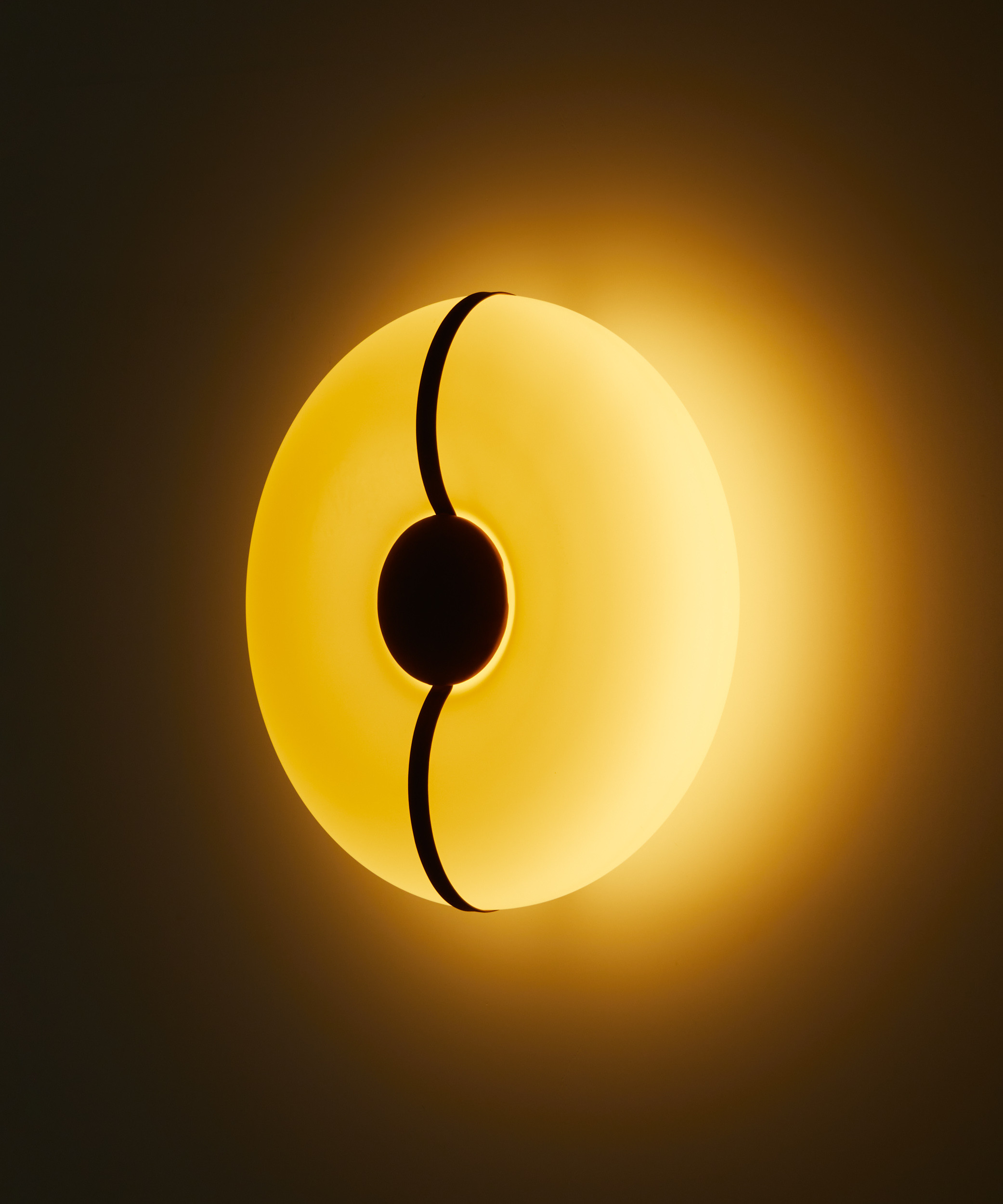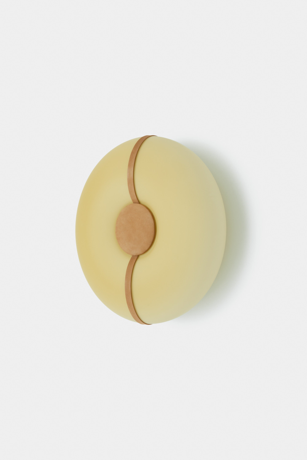 The luminous body, crafted in satin amber glass with caramel nubuck leather straps or in satin white glass with light beige leather, shapes soft, welcoming volumes, like a lifebuoy embracing the light.