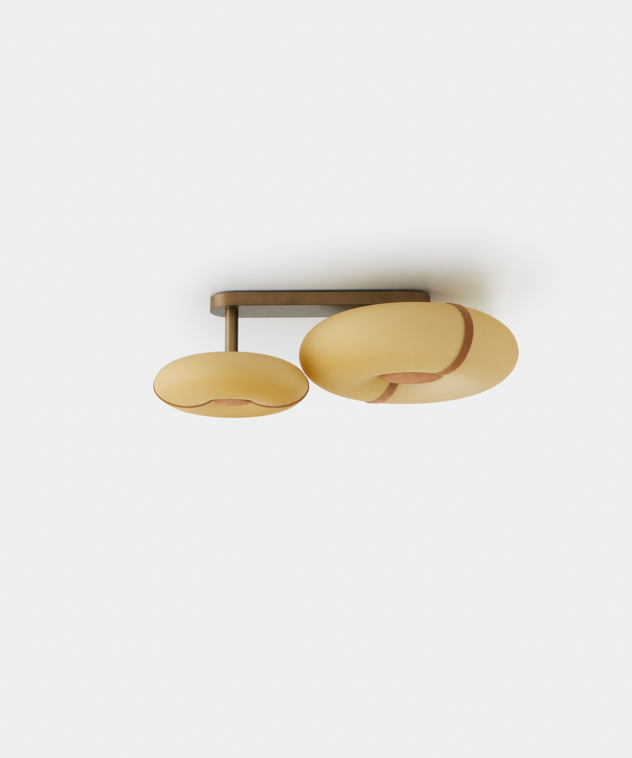 The luminous body, crafted in satin amber glass with caramel nubuck leather straps or in satin white glass with light beige leather, shapes soft, welcoming volumes, like a lifebuoy embracing the light.