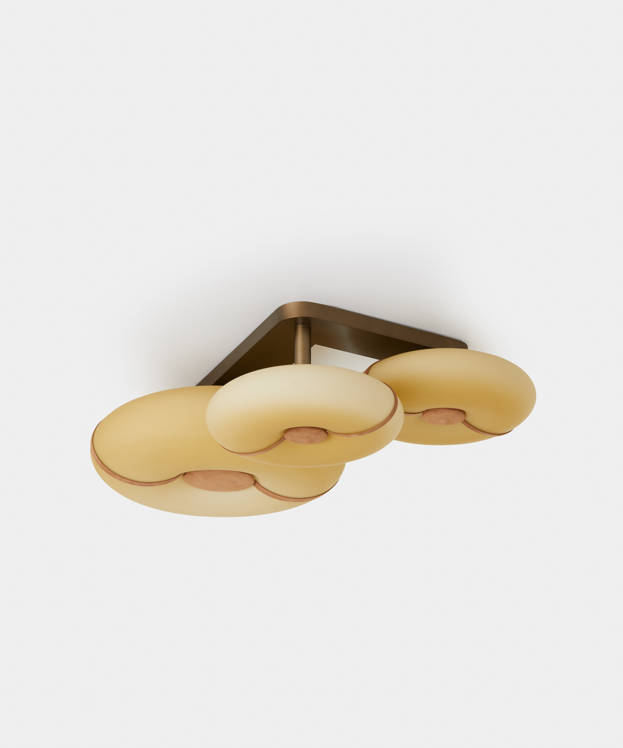 The luminous body, crafted in satin amber glass with caramel nubuck leather straps or in satin white glass with light beige leather, shapes soft, welcoming volumes, like a lifebuoy embracing the light.
