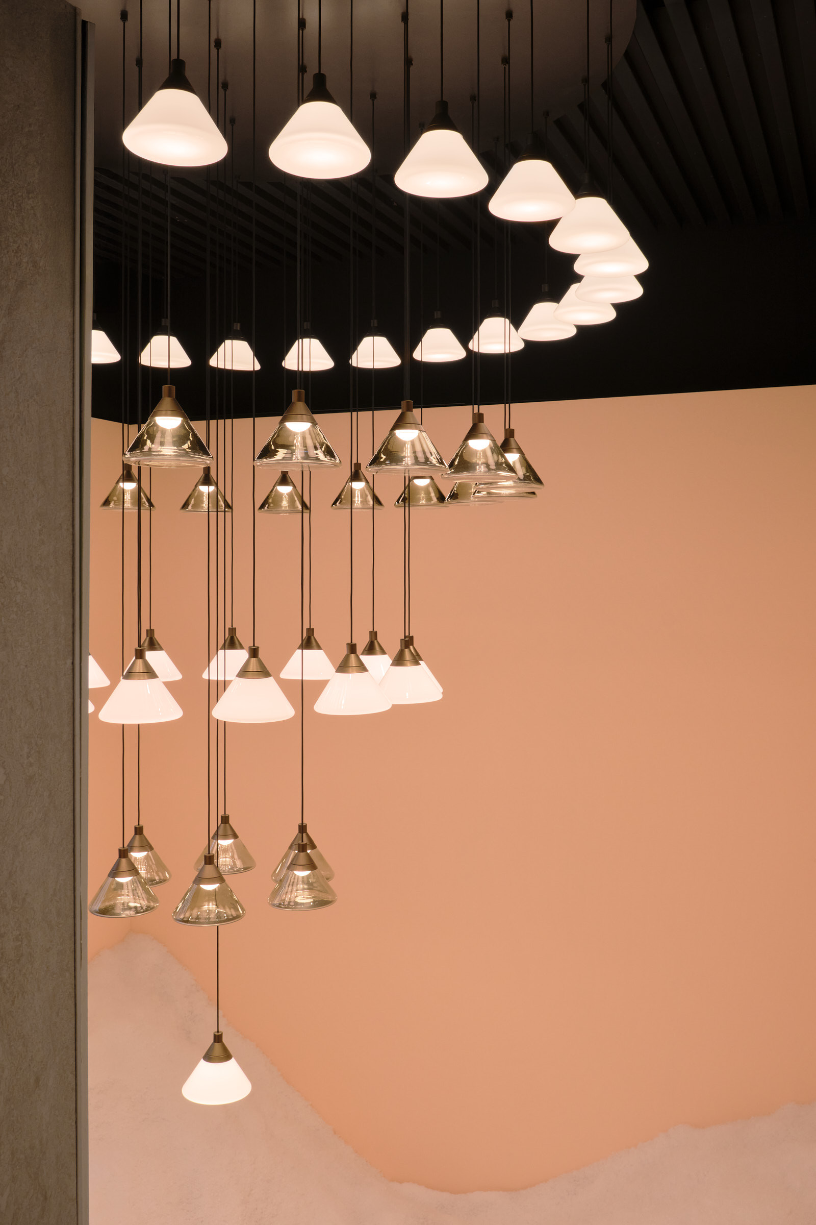 Inspired and characterized by the natural world, the Linfa family of lamps designed by Federico Peri unfolds on arms so sinuous and elegant as to evoke the veins that run through the leaves, with bright points of light that shine like dew drops. In this family, made up of pendant, floor, table lamps and wall sconces, the refined branches are available in gold, titanium or matt nickel finishes, while the light sources, made of Murano glass, are available in smoky and transparent finishes or milky white.