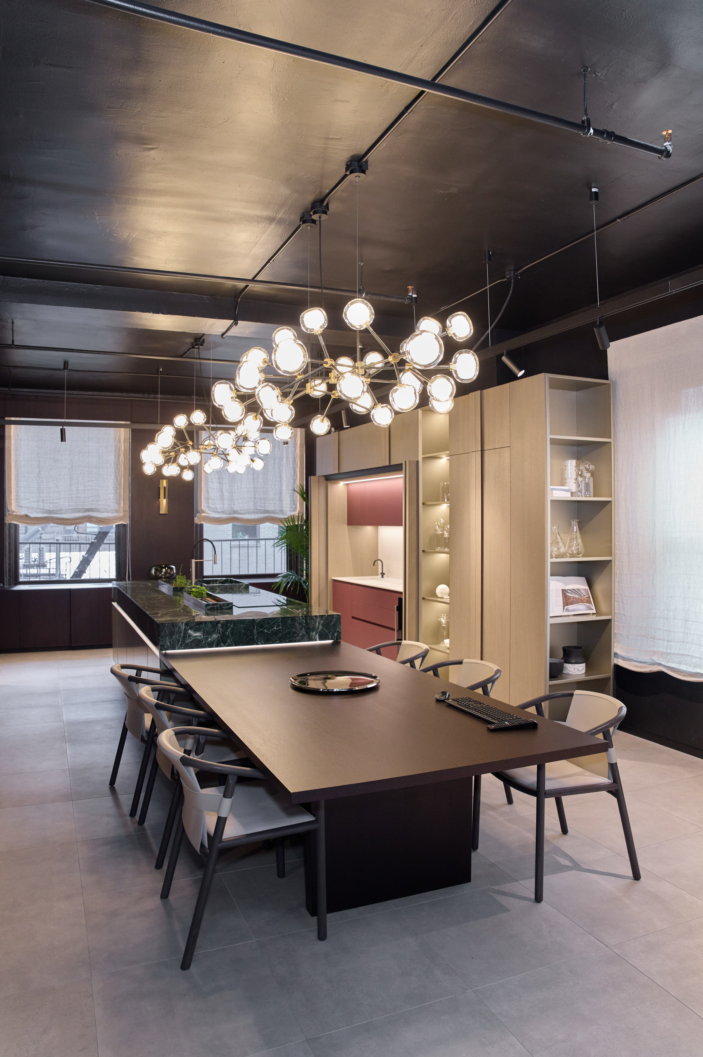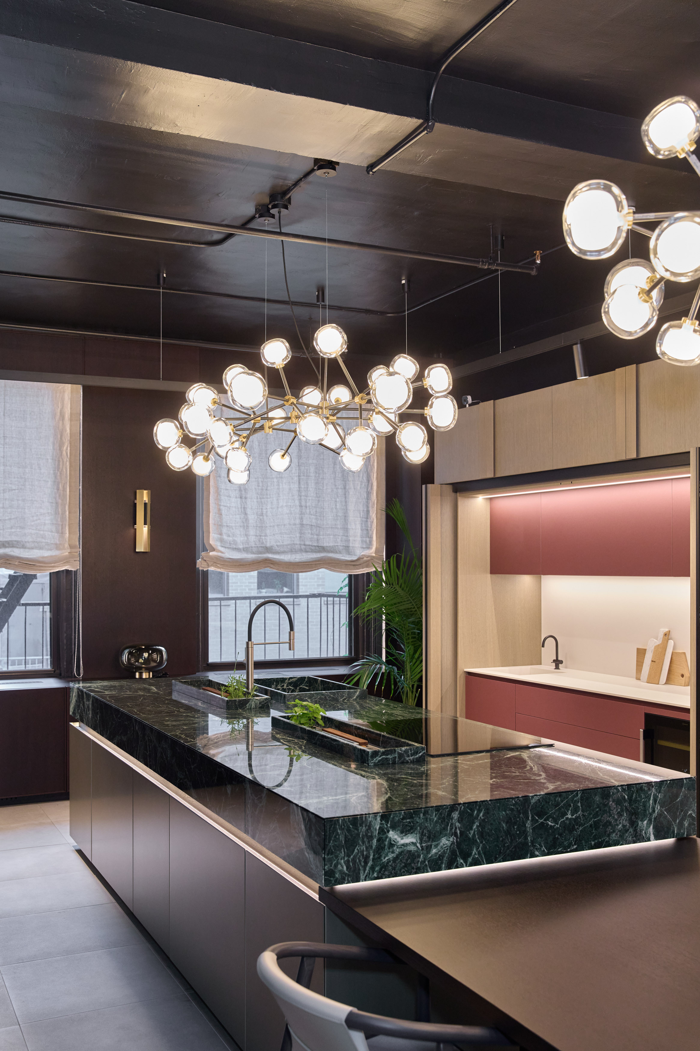 50s inspired collection of elegant and sophisticated lamps representing the detail to enrich any location. A double-sided spherical bright object in borosilicate glass makes these lamps available in different compositions and a structure made by metal coated with epoxy powder enriched with brushed brass or black chrome details. Different varieties are available for any situation: chandeliers (in different models) or table lamp, bedside (smaller), floor or wall (available in three different models for single or composite personalized installation). The chandeliers can be customized by combining the various types together in order to create new unique dimensions for each environment. Richness and sobriety all in one single element.