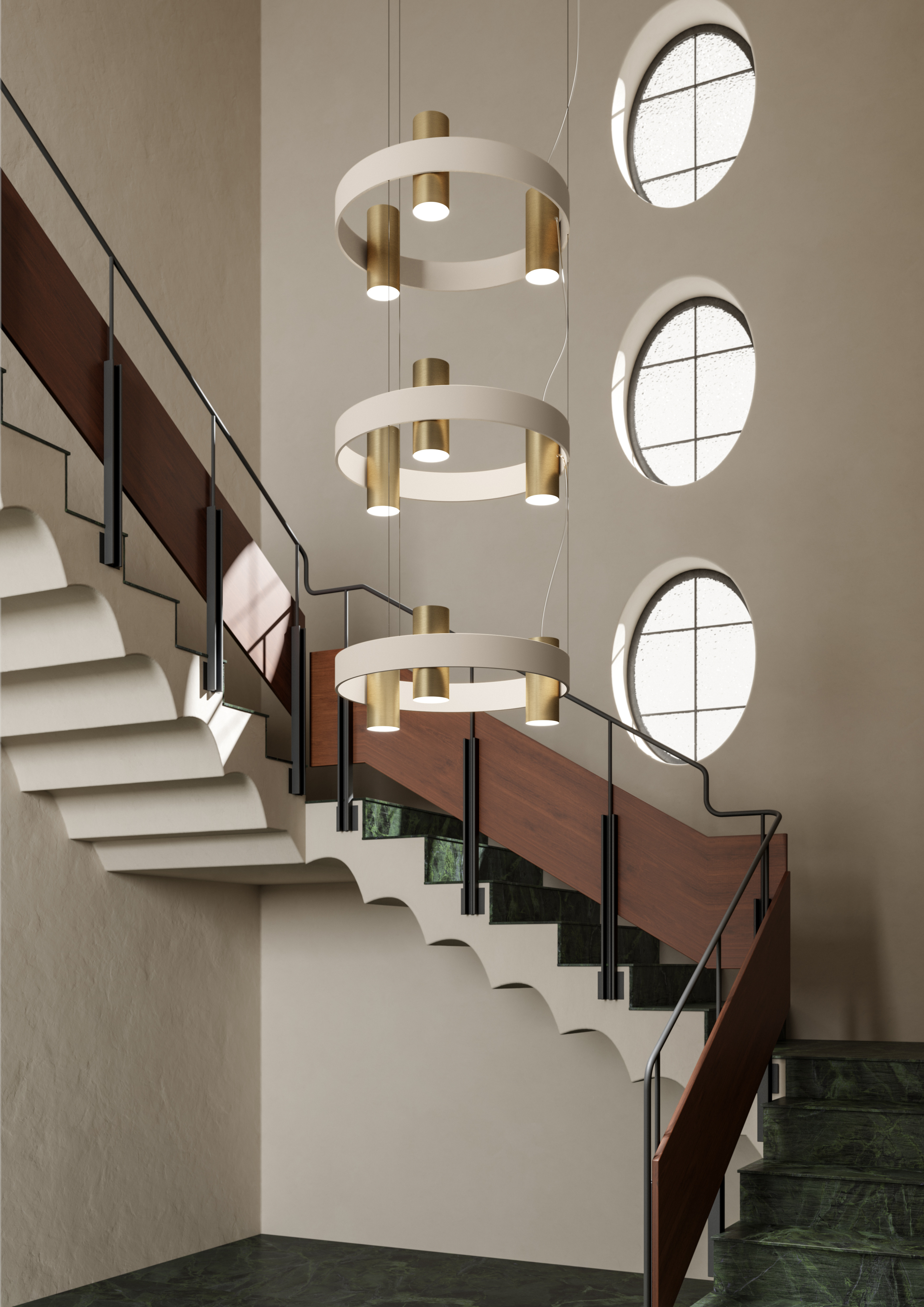 The famous Nastro family composed of pendant, wall, floor and table lamps, designed by Studiopepe, sees two new important interpretations. These interpretations move in the wake of an aesthetic based on the balance of a cylindrical weight in a band structure made of aluminium and painted with epoxy powder. The system therefore includes a new scenography; a suspension characterized by the positioning of the light sources within closed circular bands.