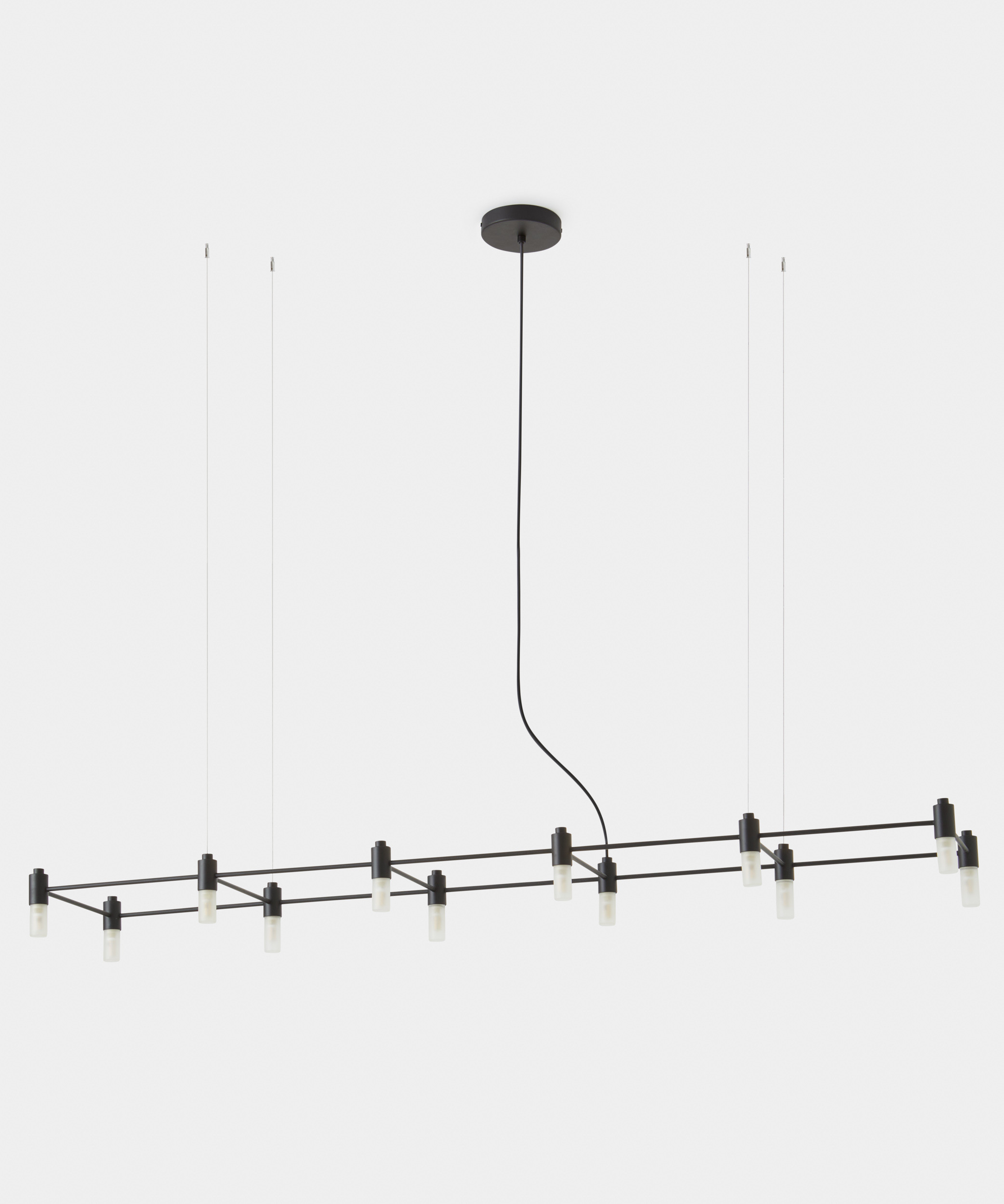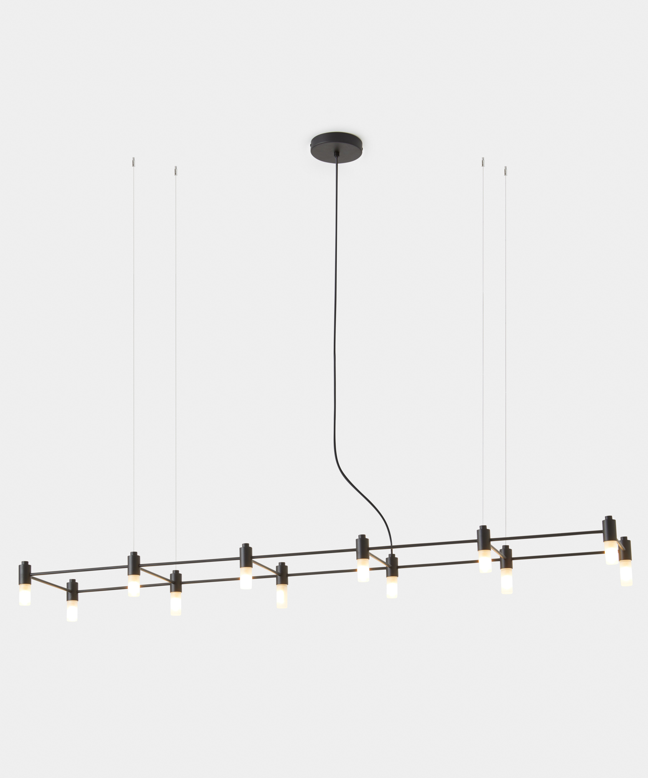 Modular suspension made of welded and powder coated steel pipes. The possible configurations are numerous and create a system of bright grids.