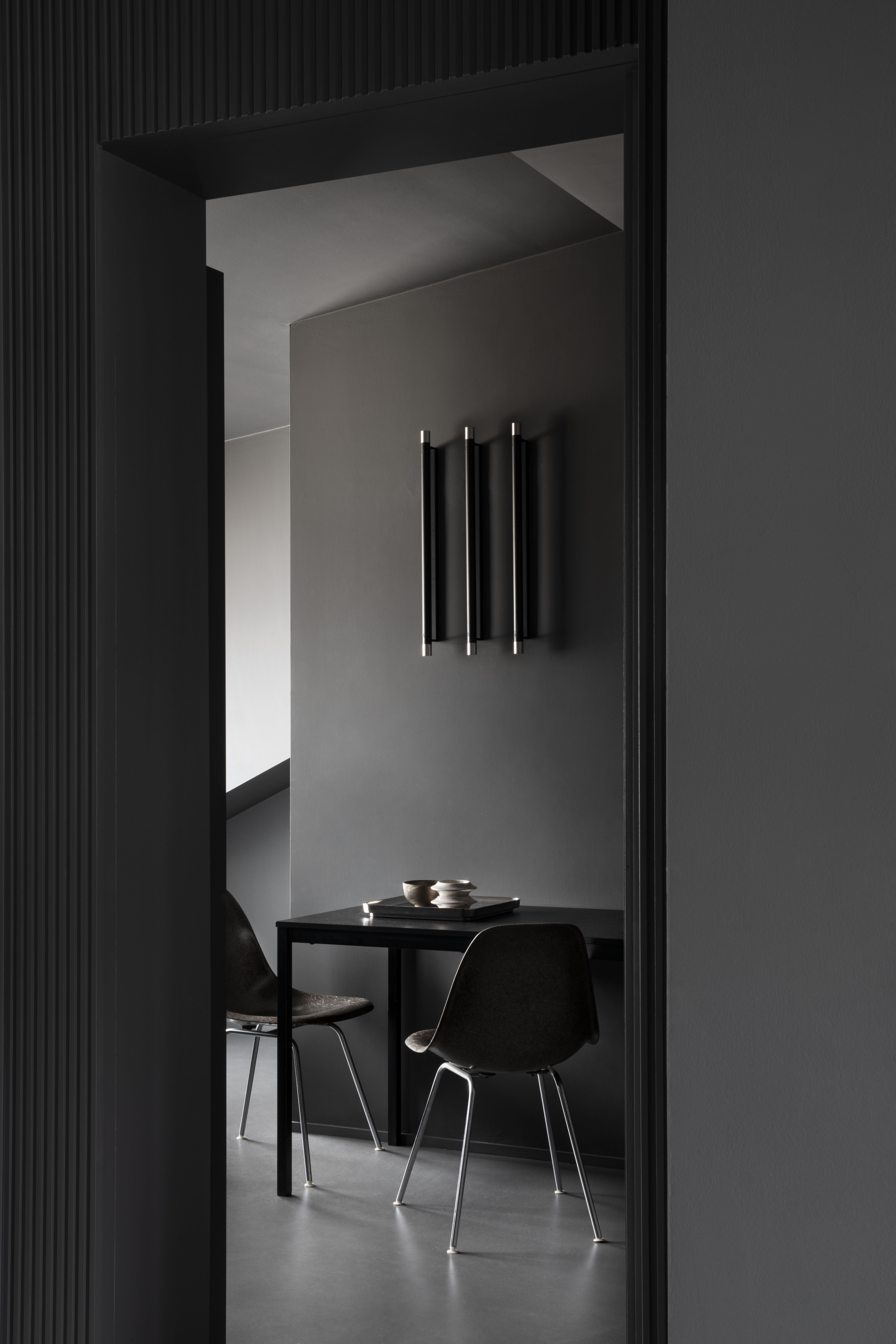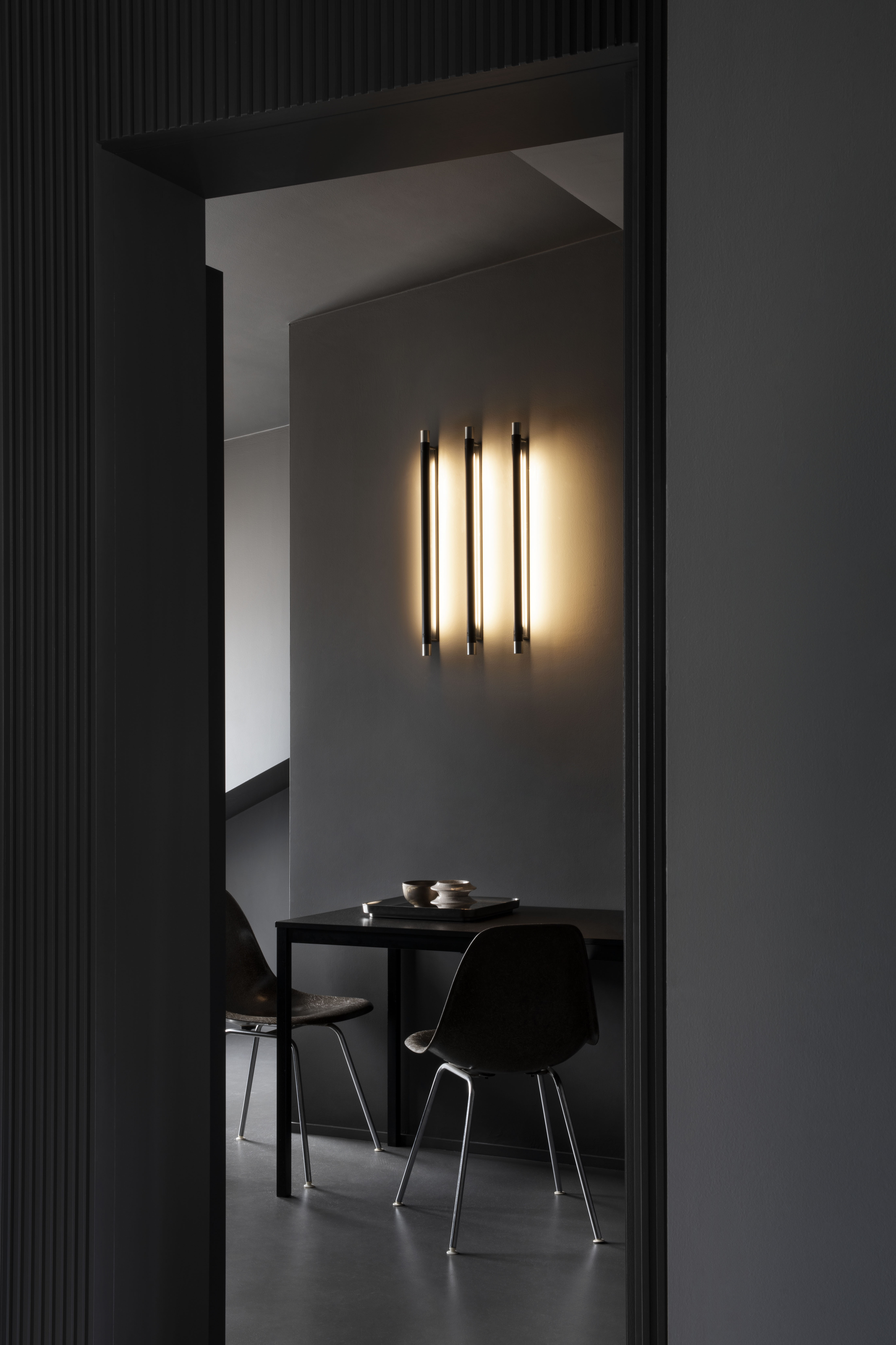 Designed by Federica Biasi, the Thula appliques and suspension lamps are based on a simple and architectural central element with an illuminating function to which an organic component in wood or quilted leather is added in a skillful game of addition and subtraction. Consists of a linear dimmable LED; in the simple wall version it can be oriented, thus giving direct or indirect light.